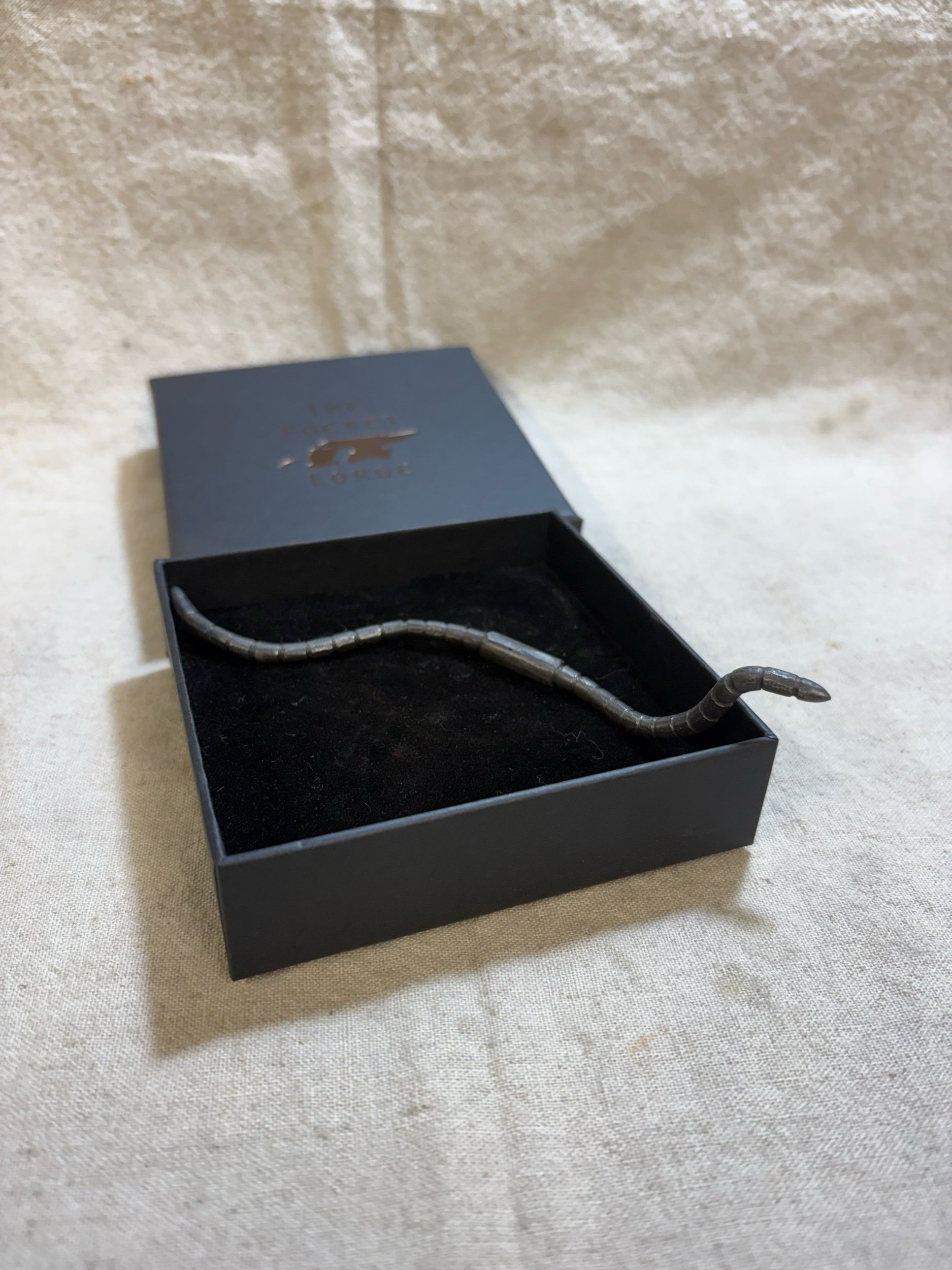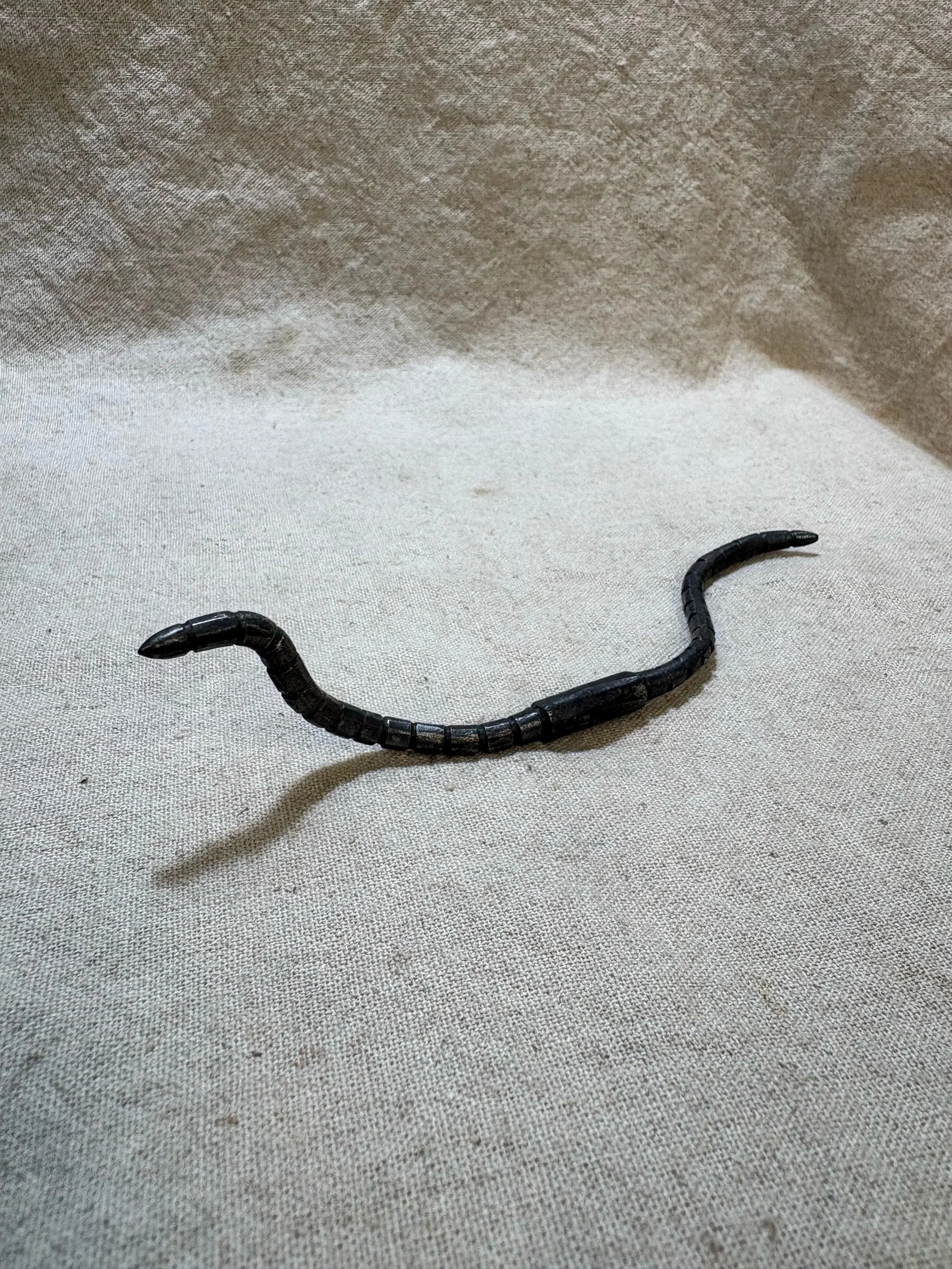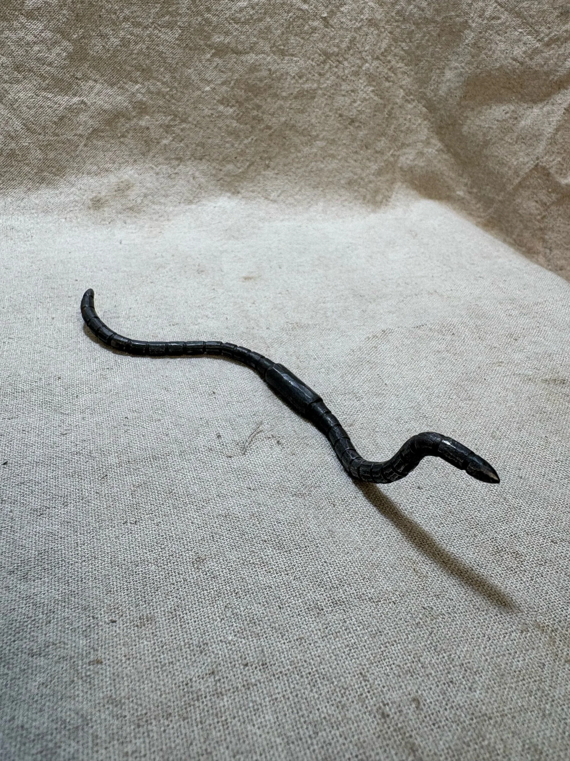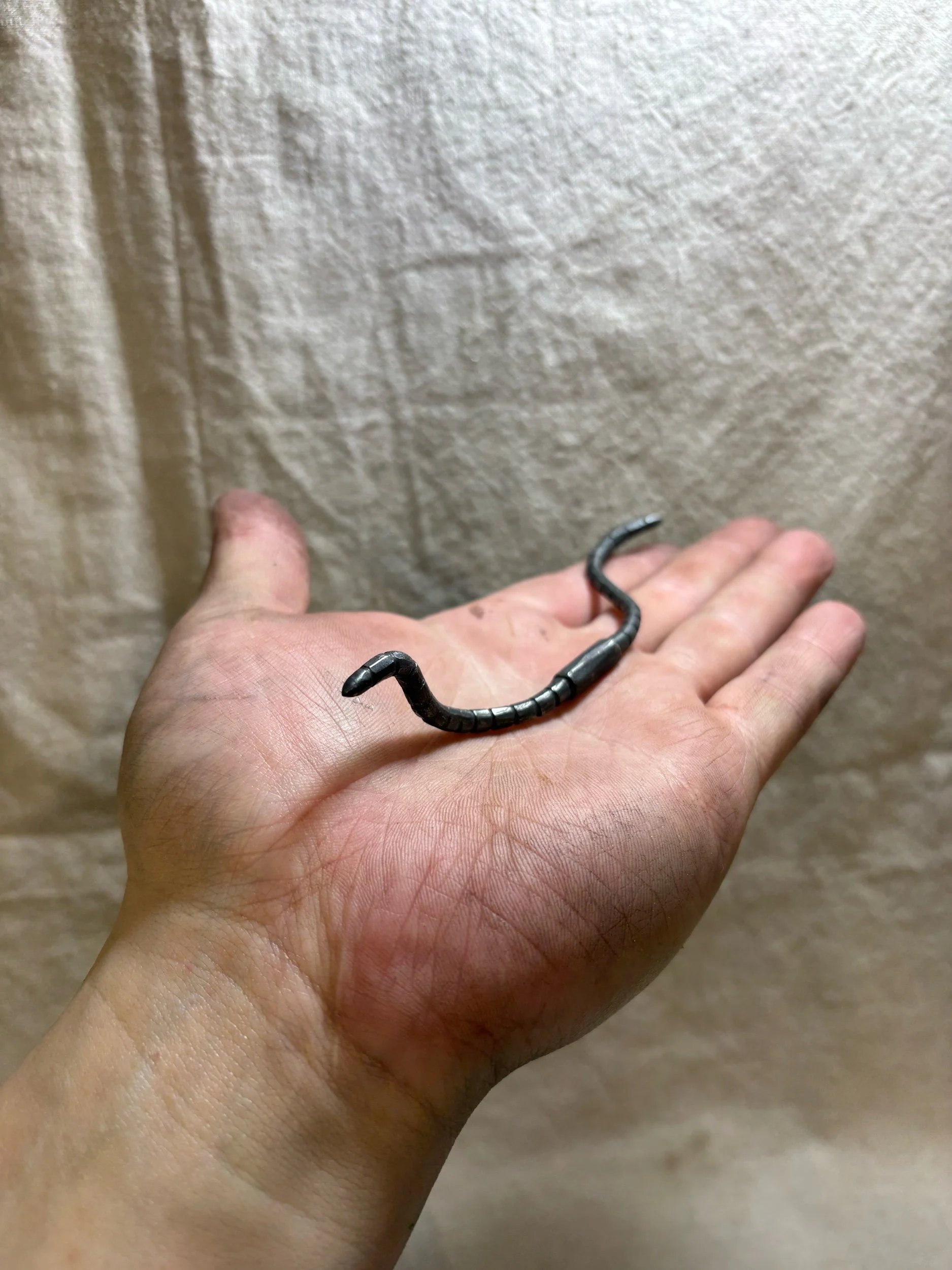 Here is a little handforged worm, made from mild steel with a scale blackened finish. My worms are all handmade and individually shaped, and each one has a unique personality!