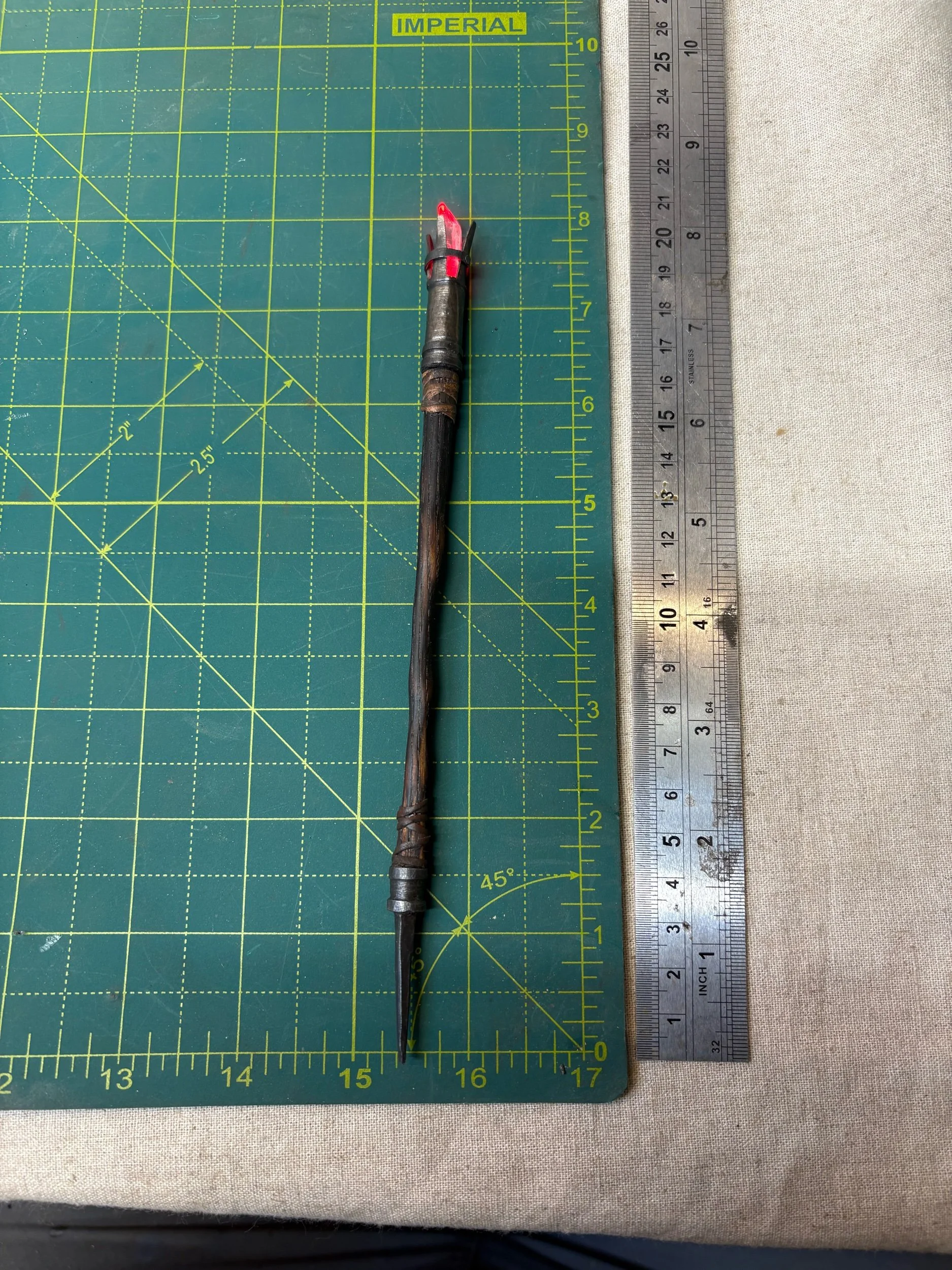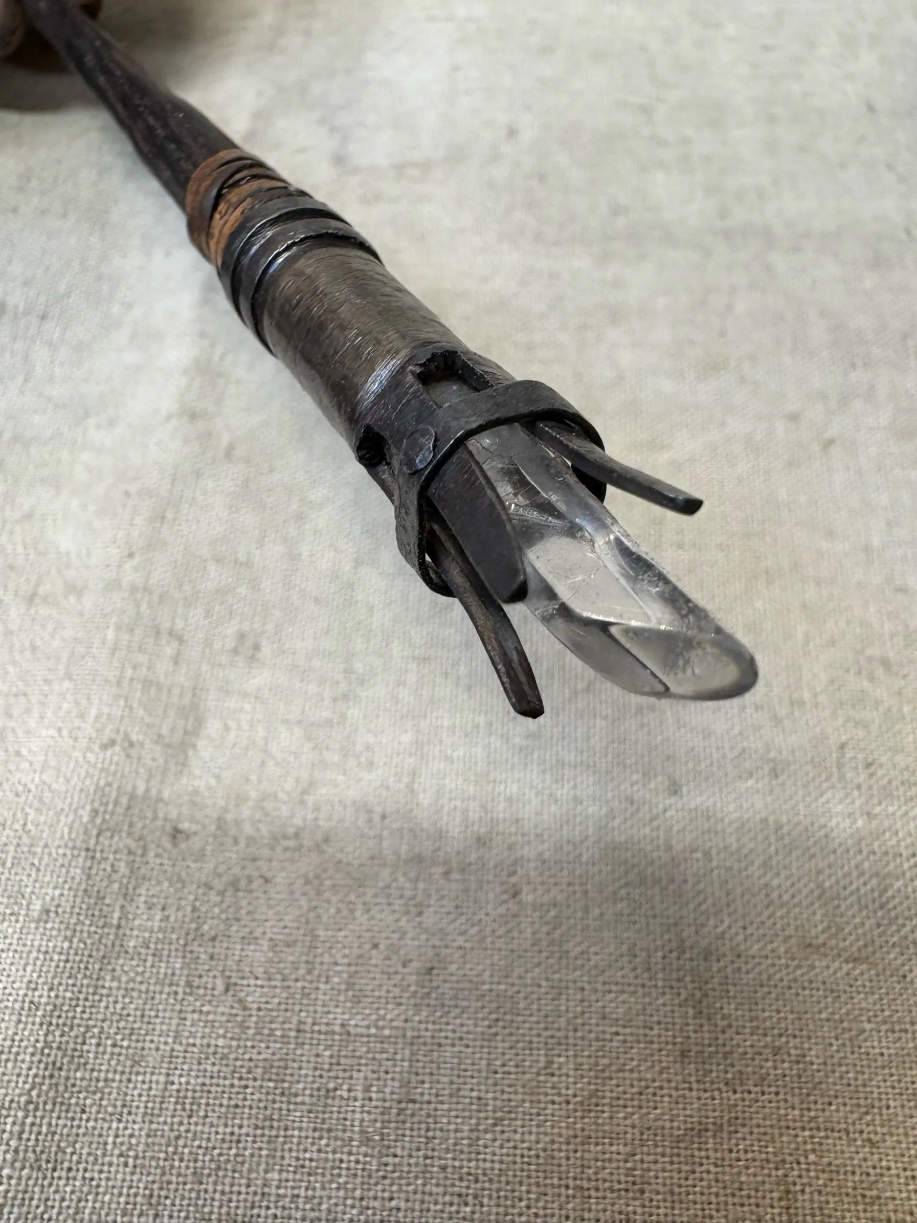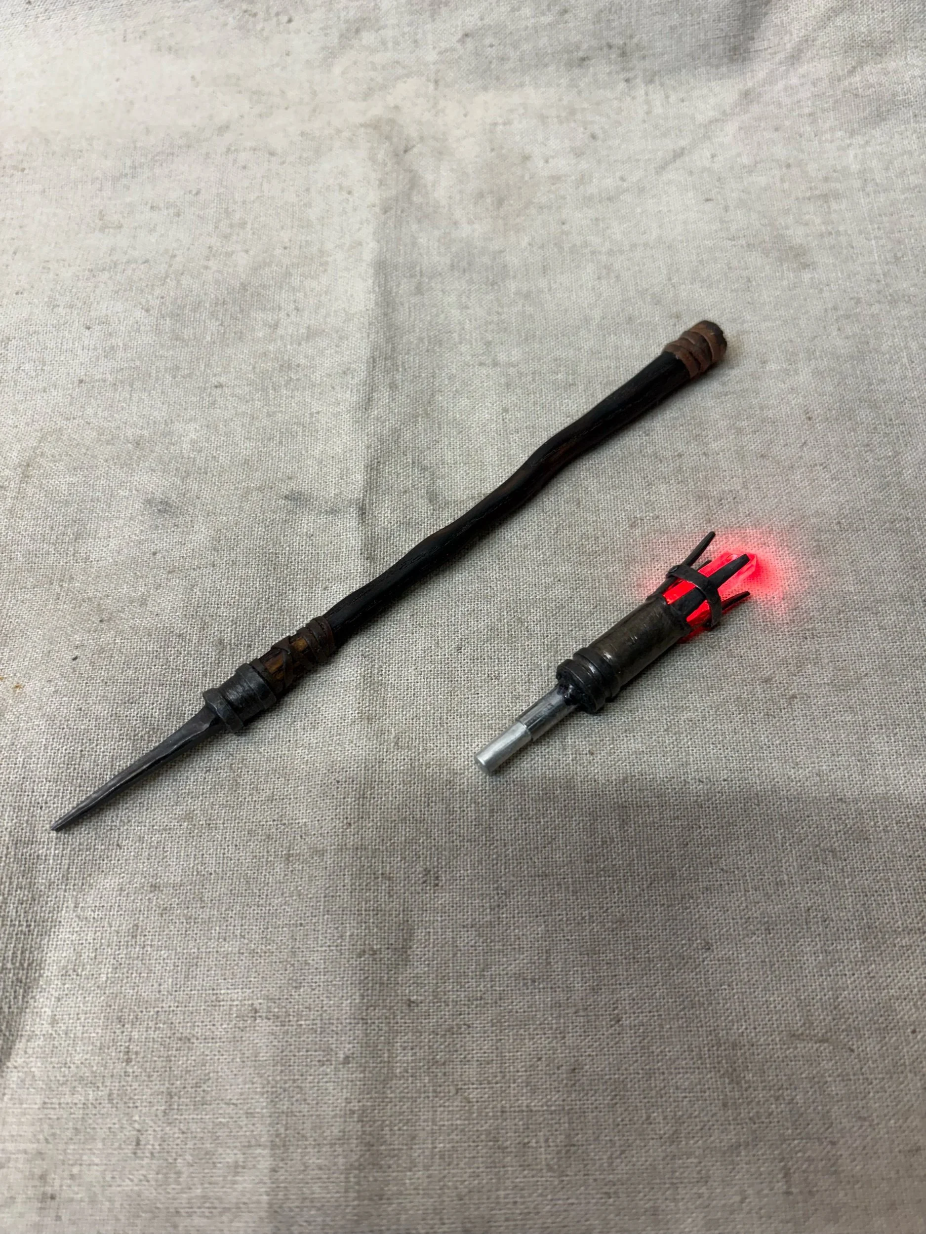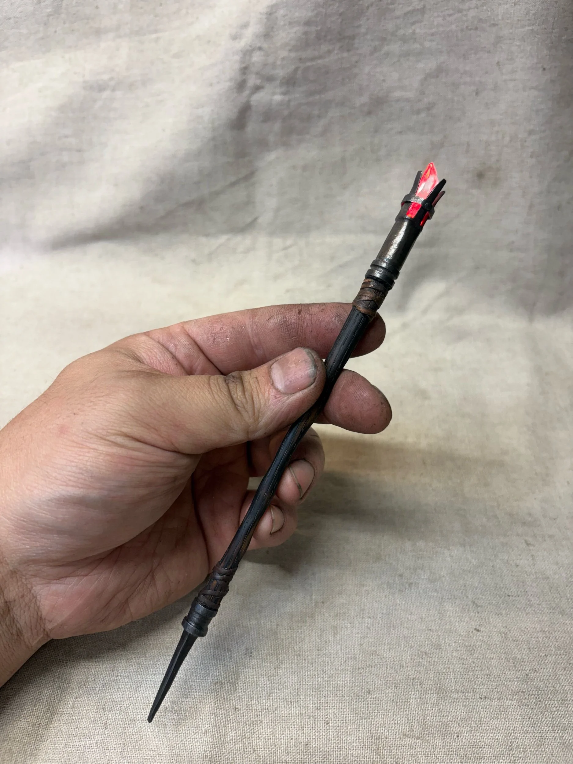 The staff is made from burnt ash wood, while the head that houses the crystal is made from mild steel. The butt is made from mild steel.
