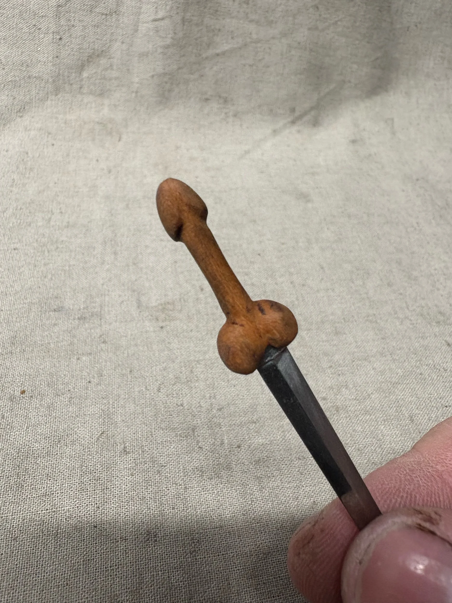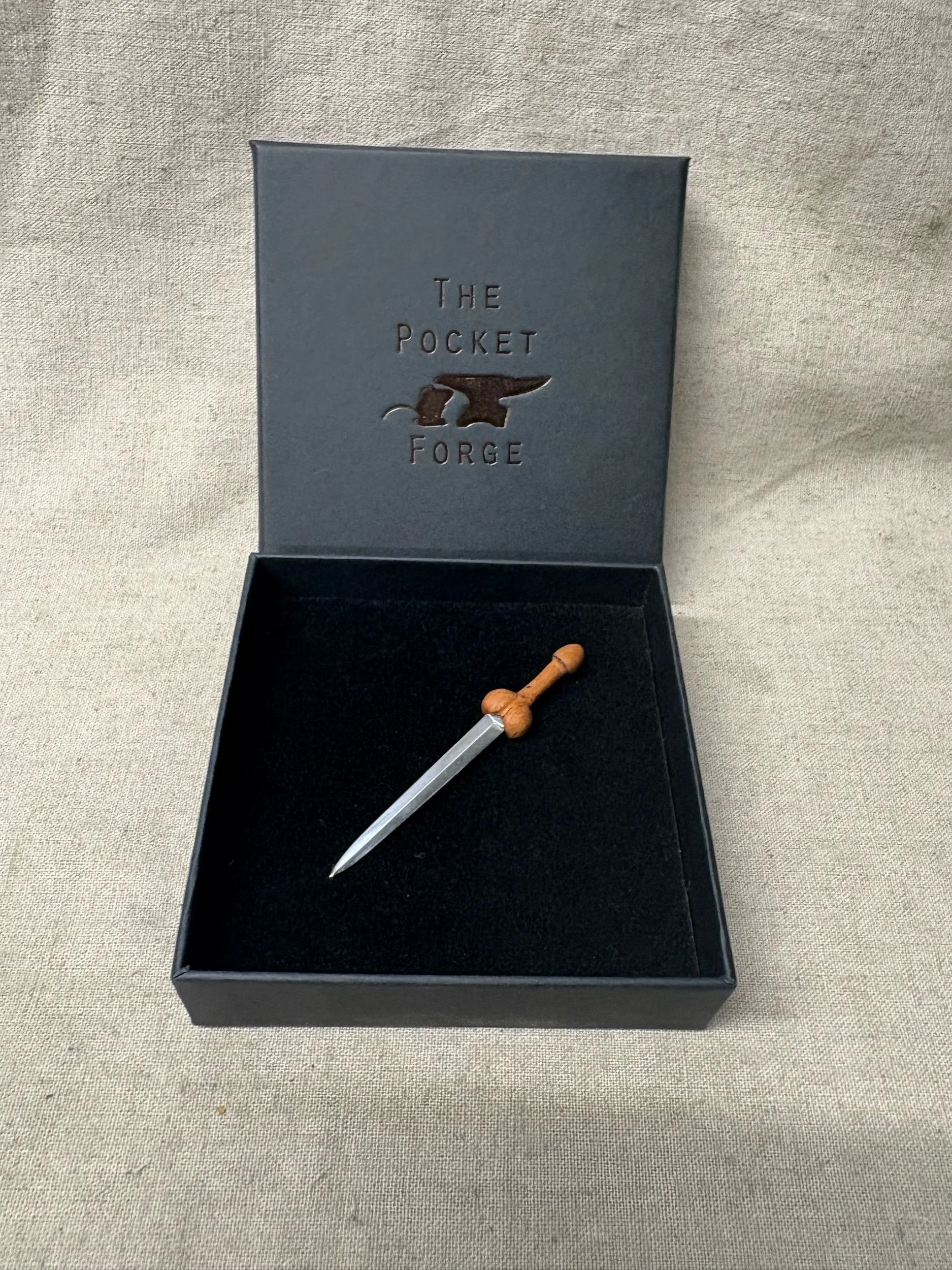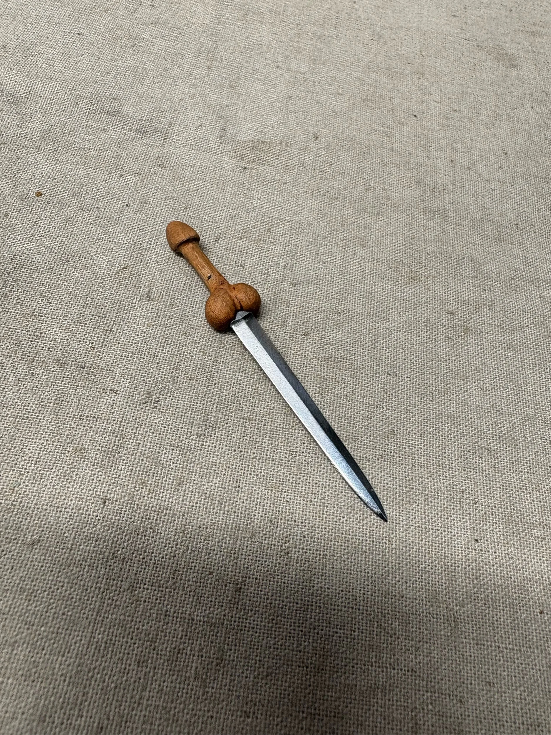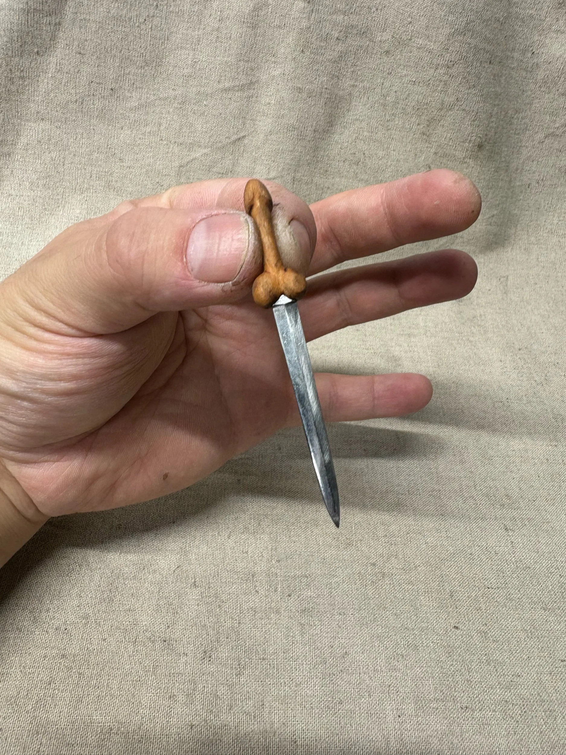 This is a tiny medieval dagger in 1:6 scale. It's forged by hand exactly the same way a full sized piece would be, heat treated and tempered, with a distinctive handle from which the dagger takes its name.