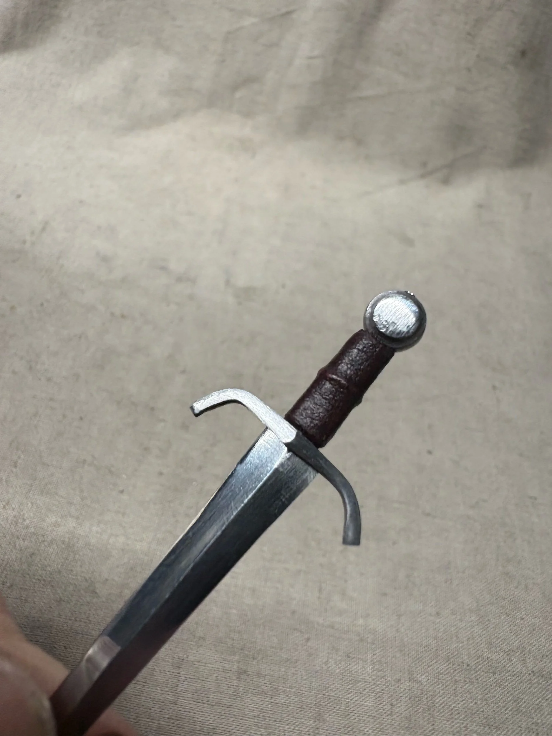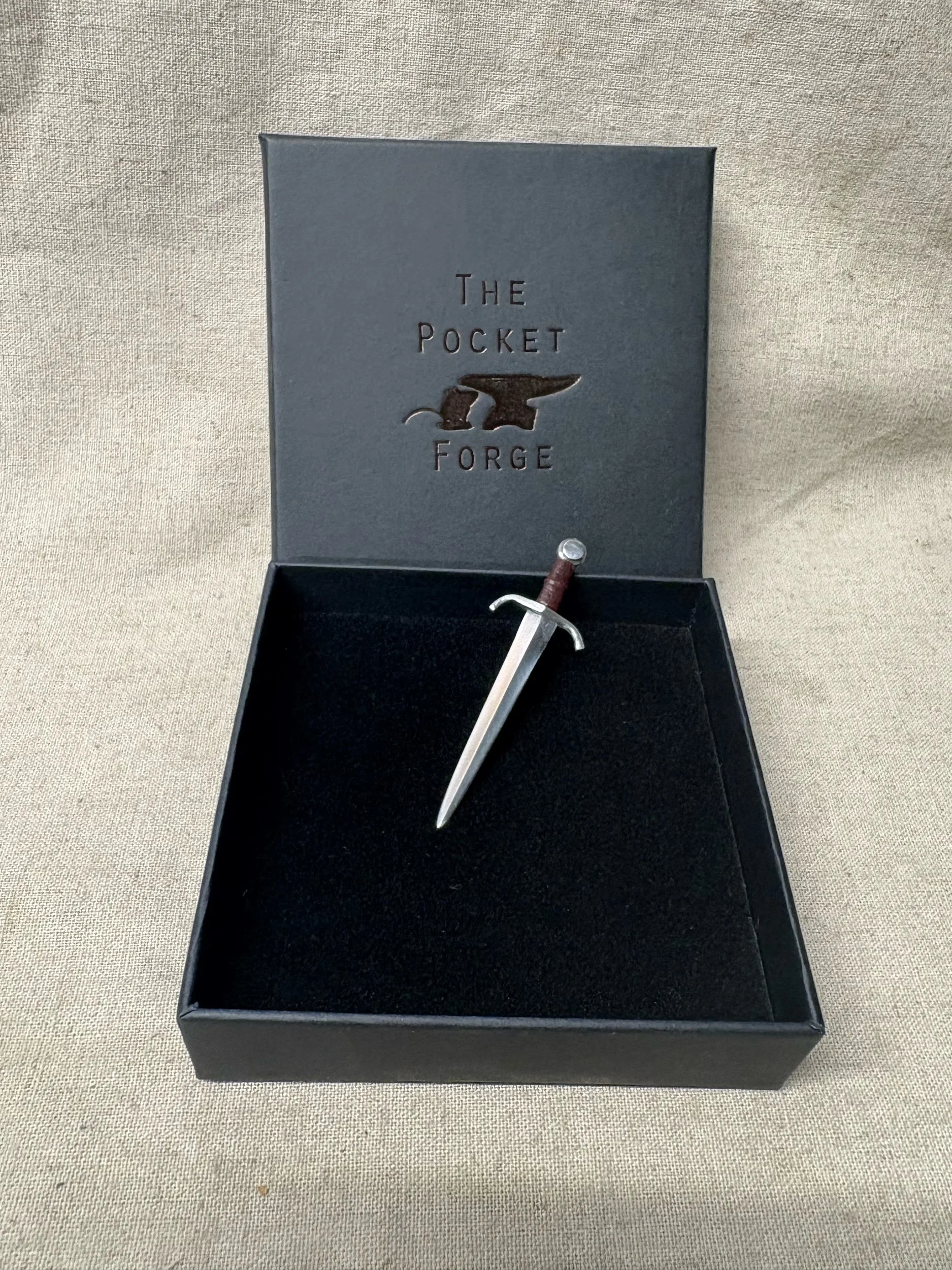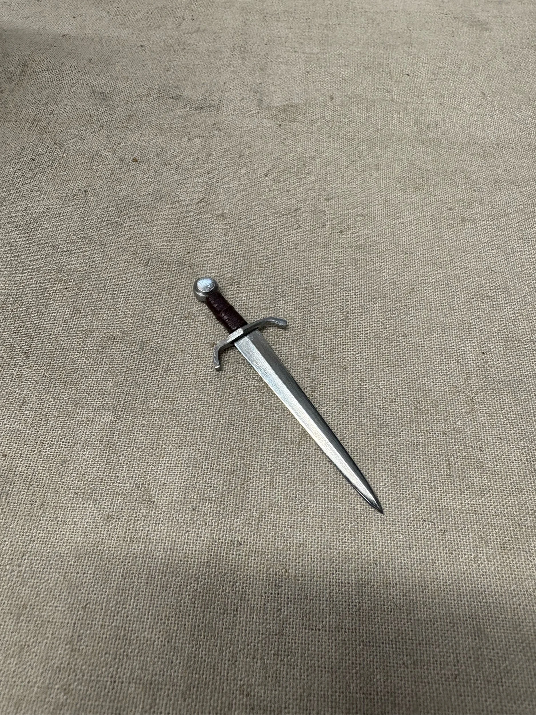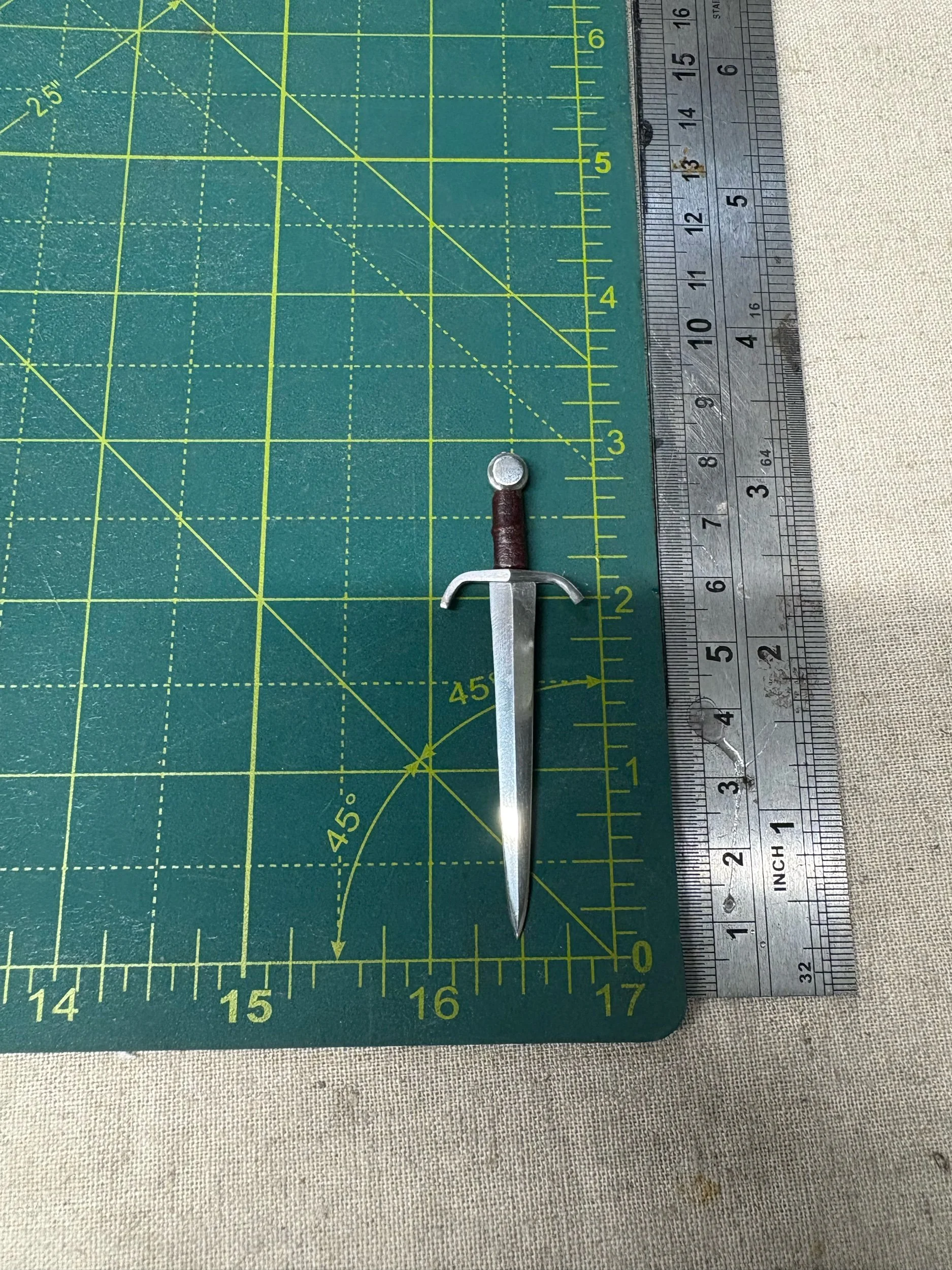 This is a tiny medieval dagger in 1:6 scale. It's forged by hand exactly the same way a full sized piece would be, heat treated and tempered, with a tang that runs through the handle, and is peened at the end of the pommel. Perfect for a tiny halfling rogue, as oft used to slice apples, pry open locks and disarm tripwires as it is for sneaky backstabs!