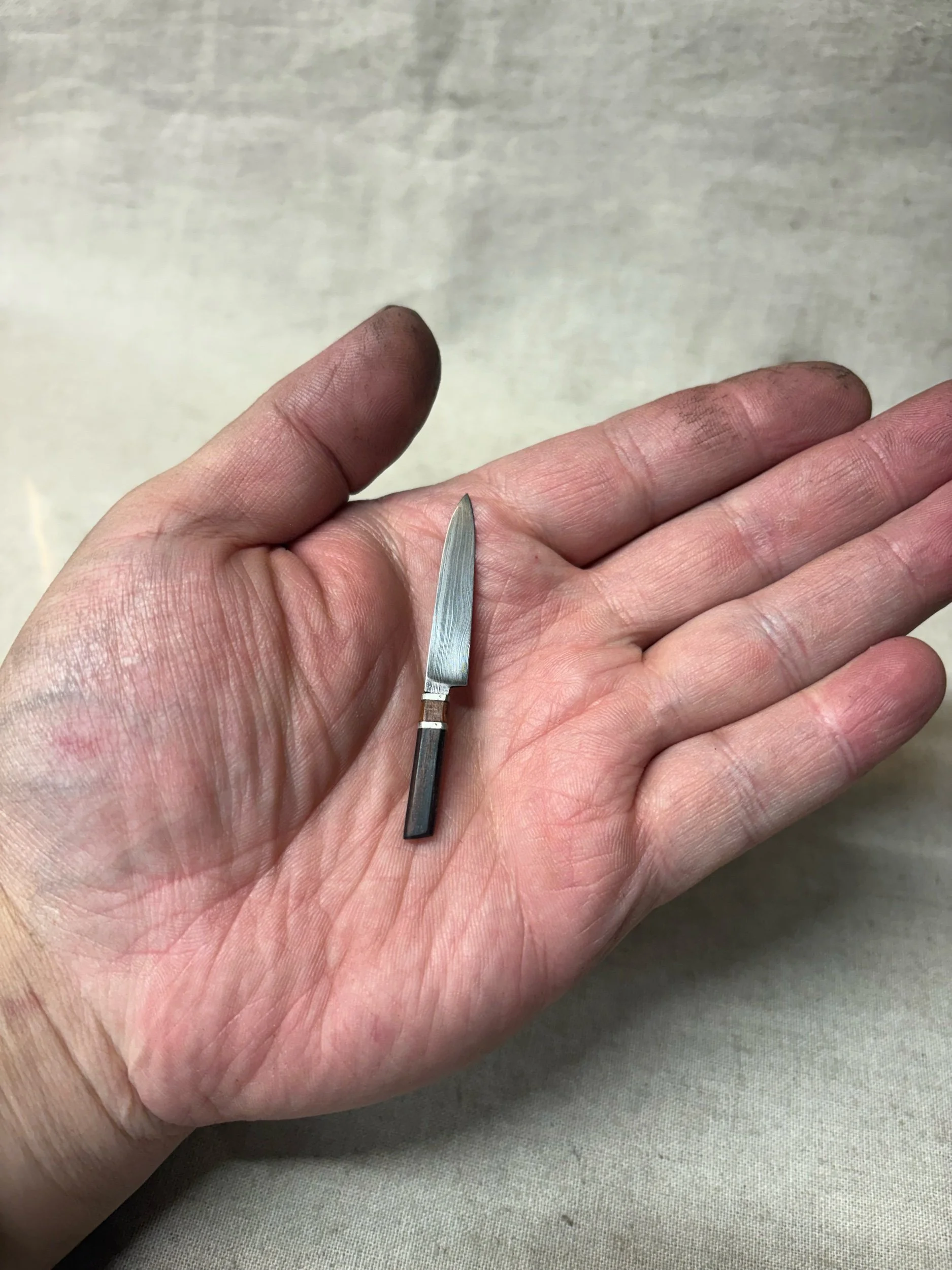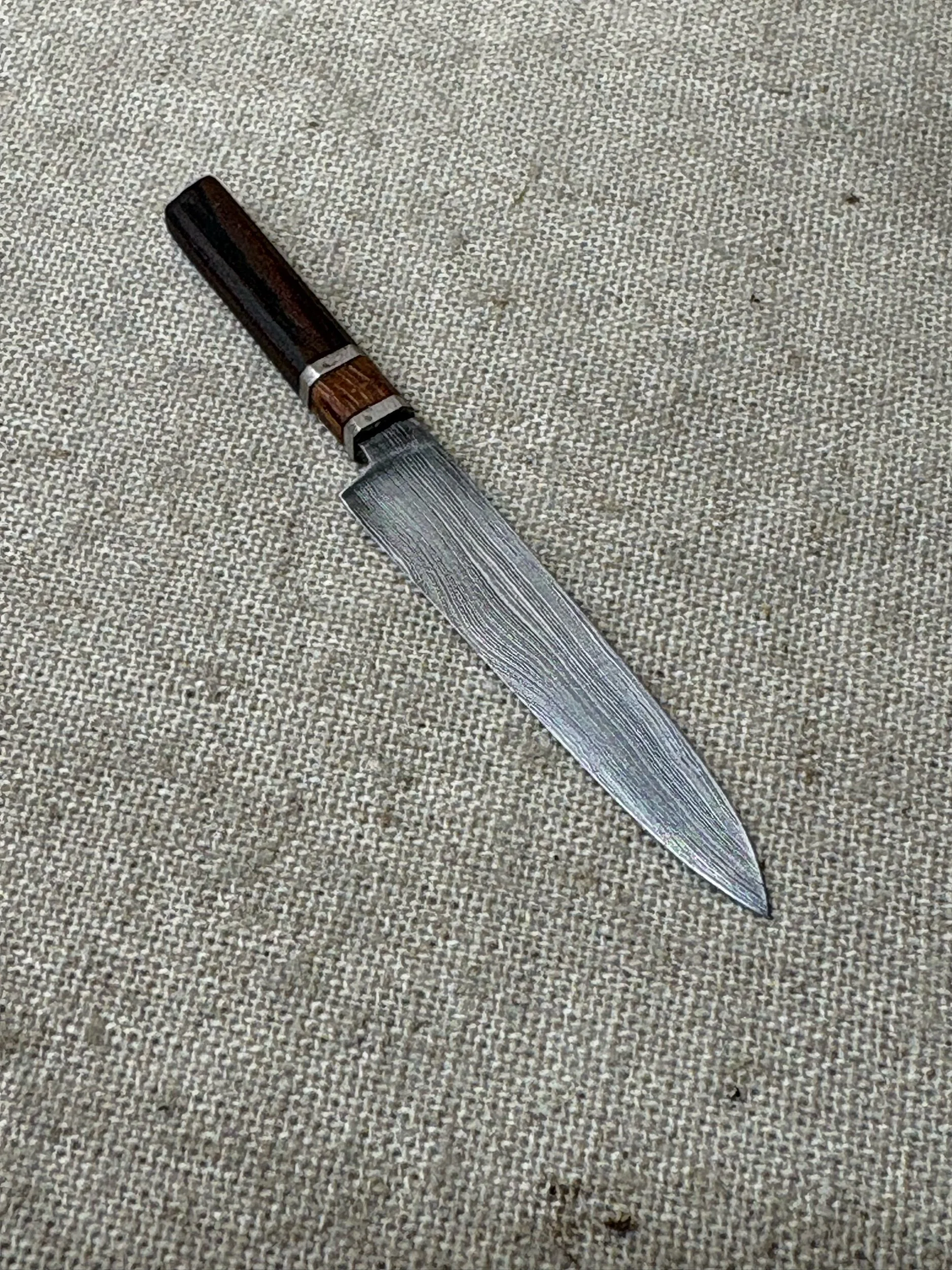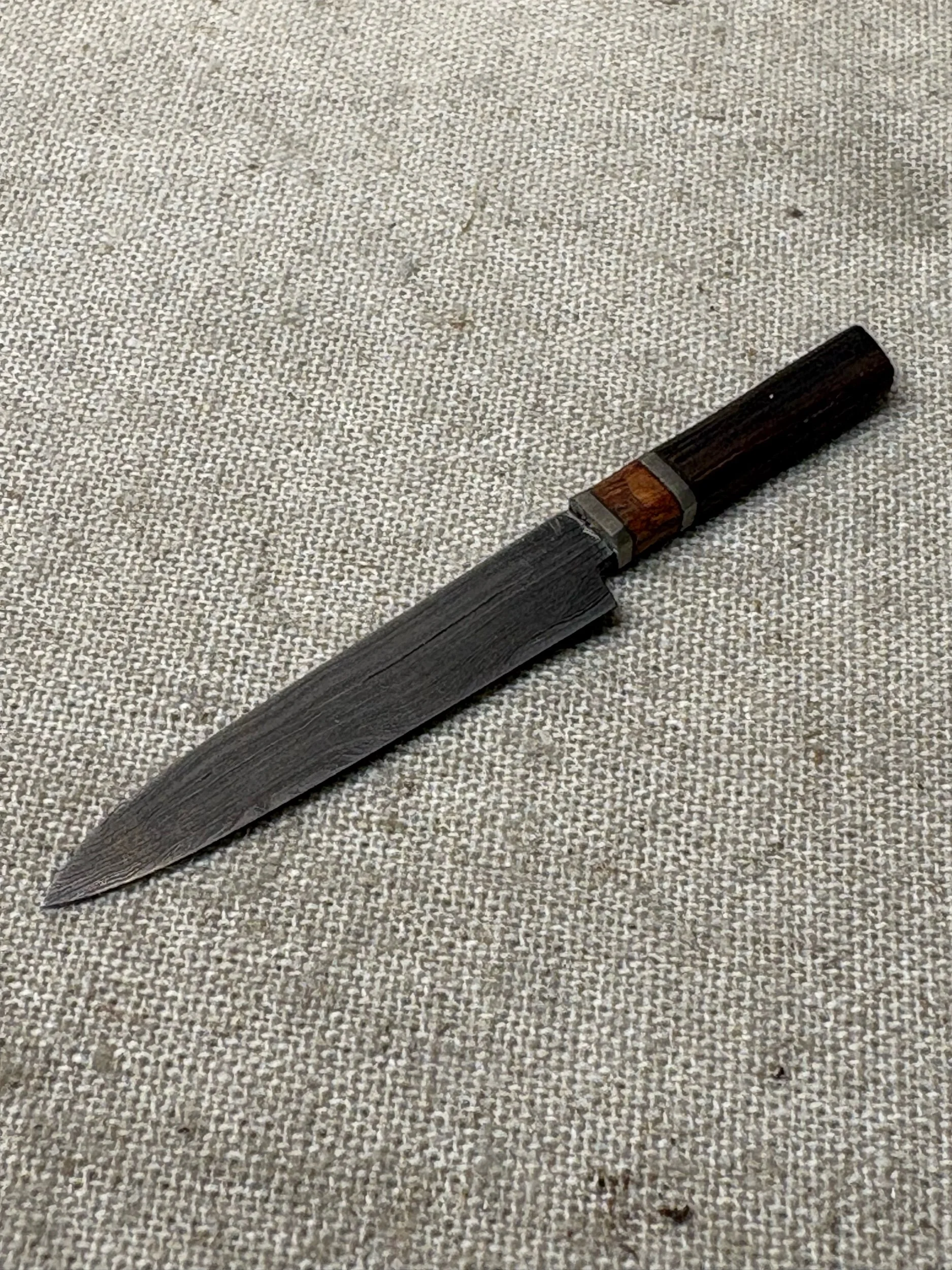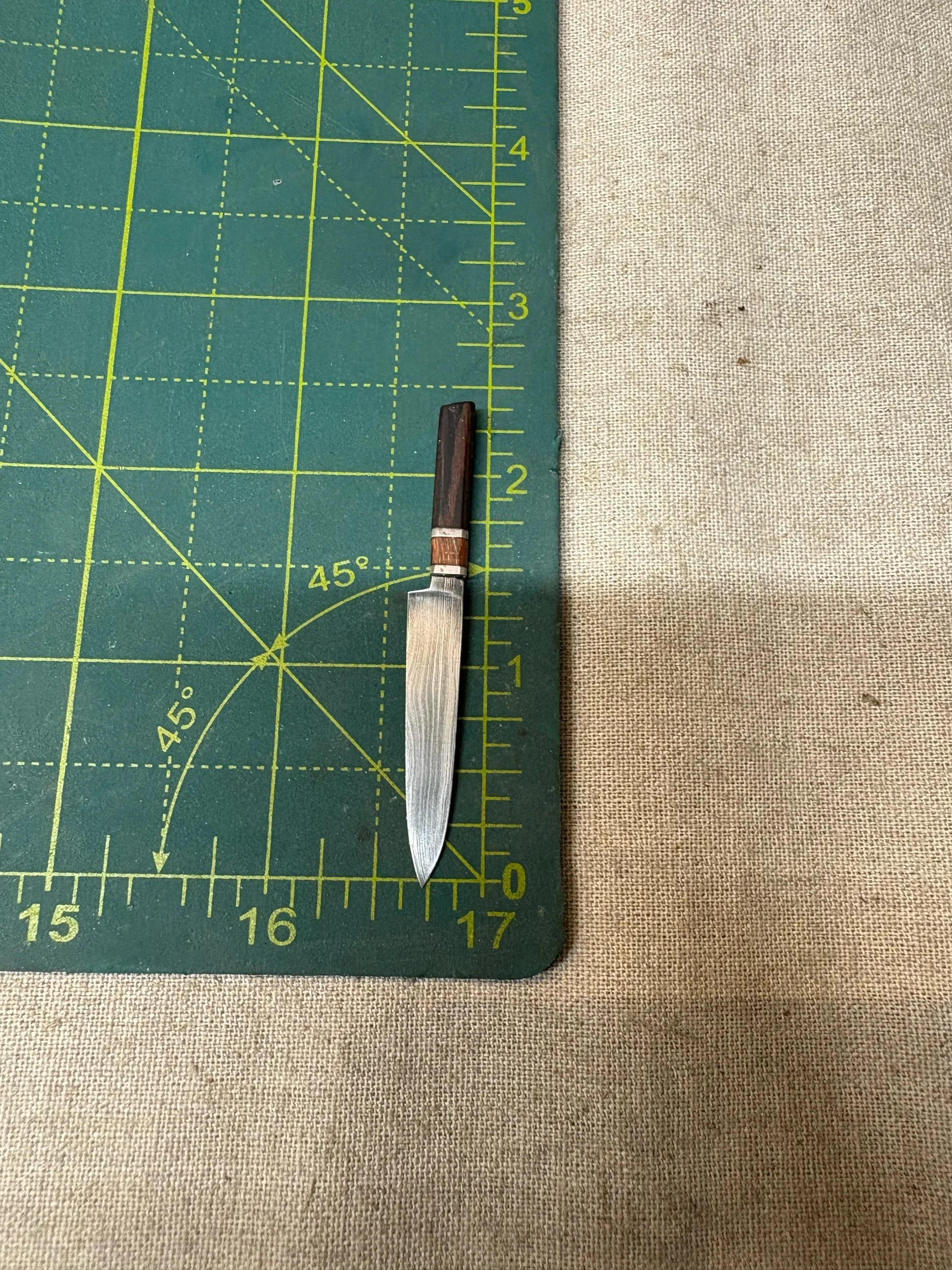 This is a miniature Japanese style chef knife with a single sided bevel. It’s hand forged and polished by hand with a sharp edge. The handle is made from nickel, chestnut burl and wenge.