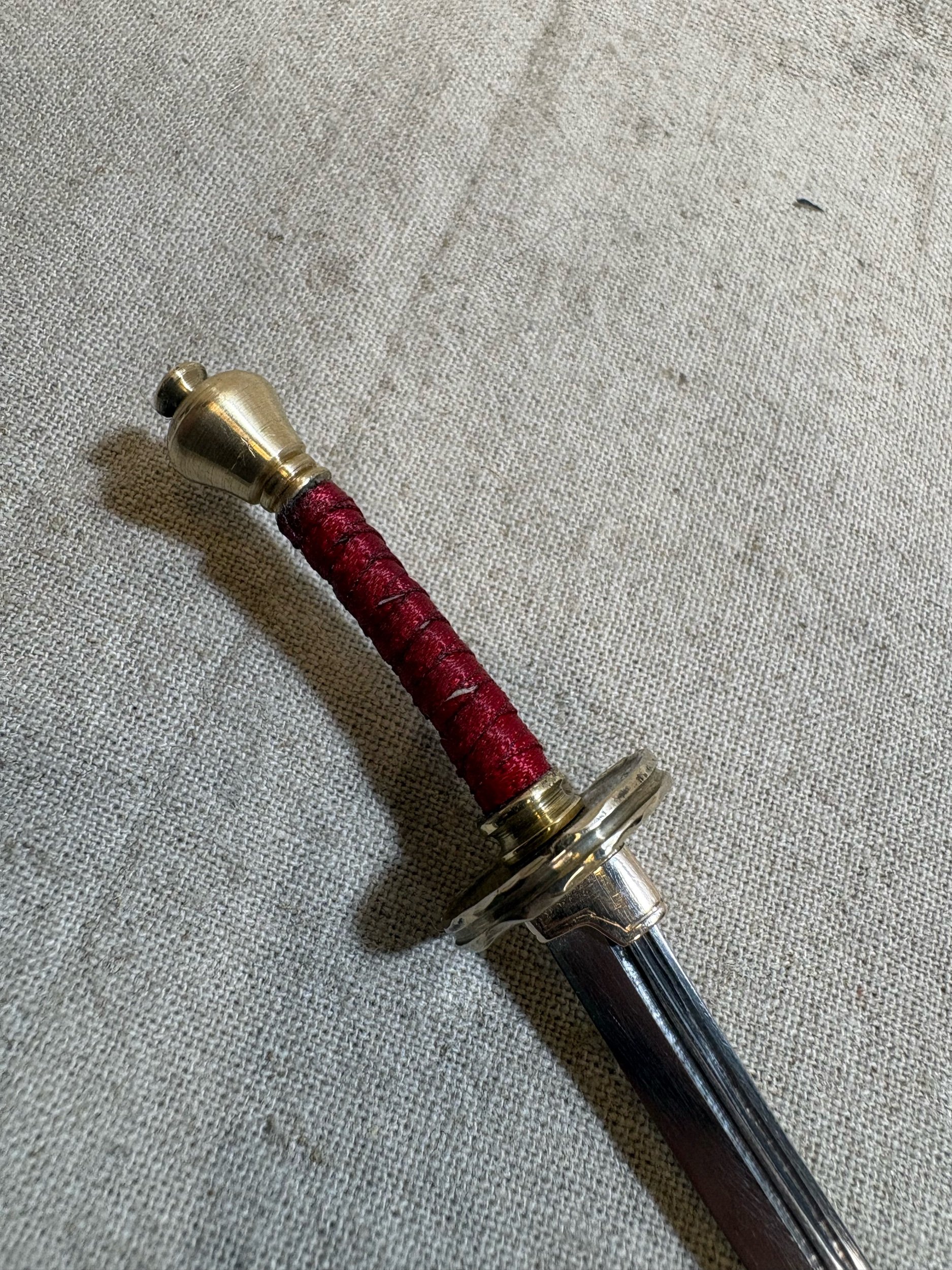 The blade is forged by hand, hardened and tempered, and the fittings made from brass. The handle consists of wooden scales, with a red silk wrap.