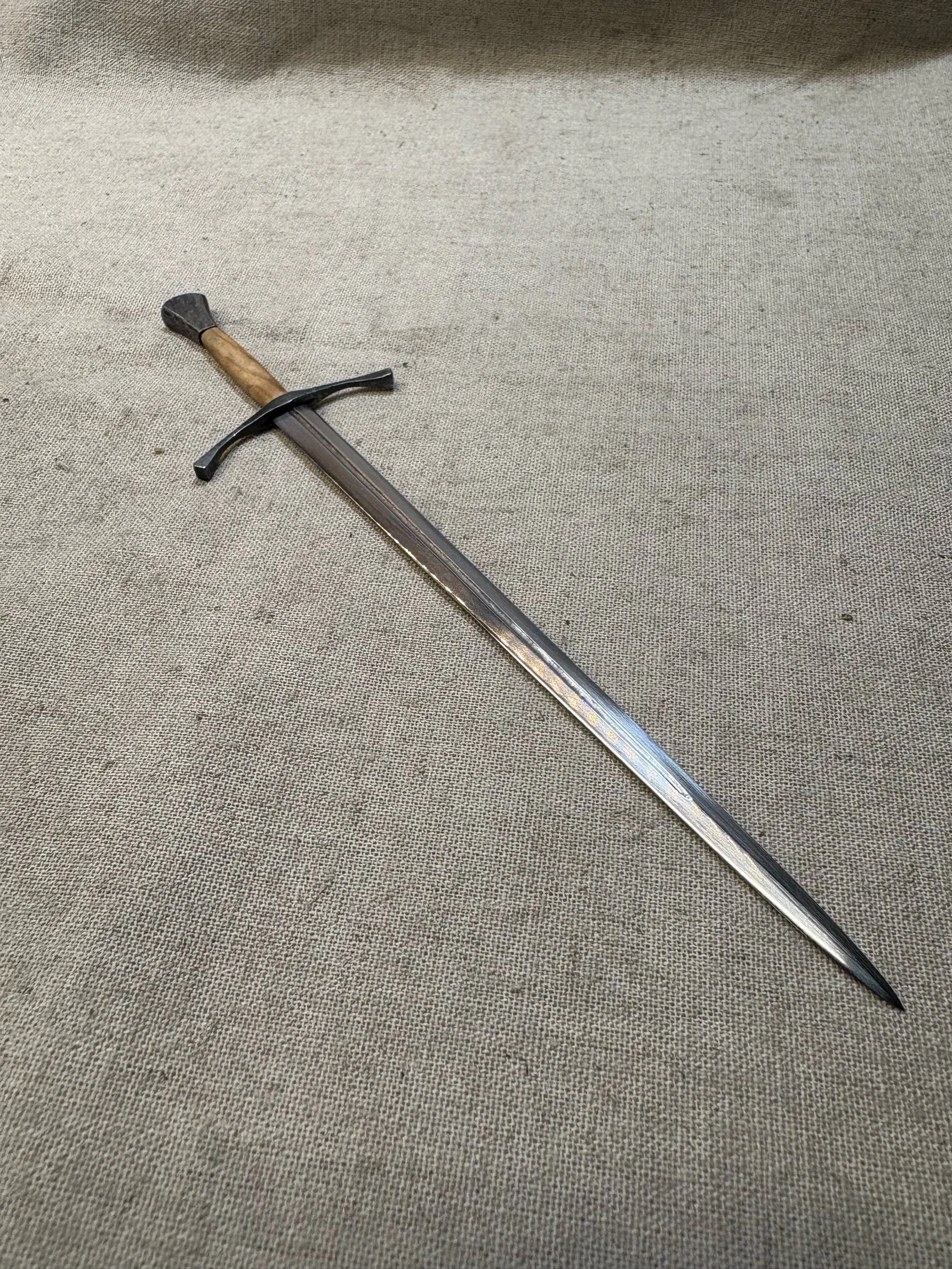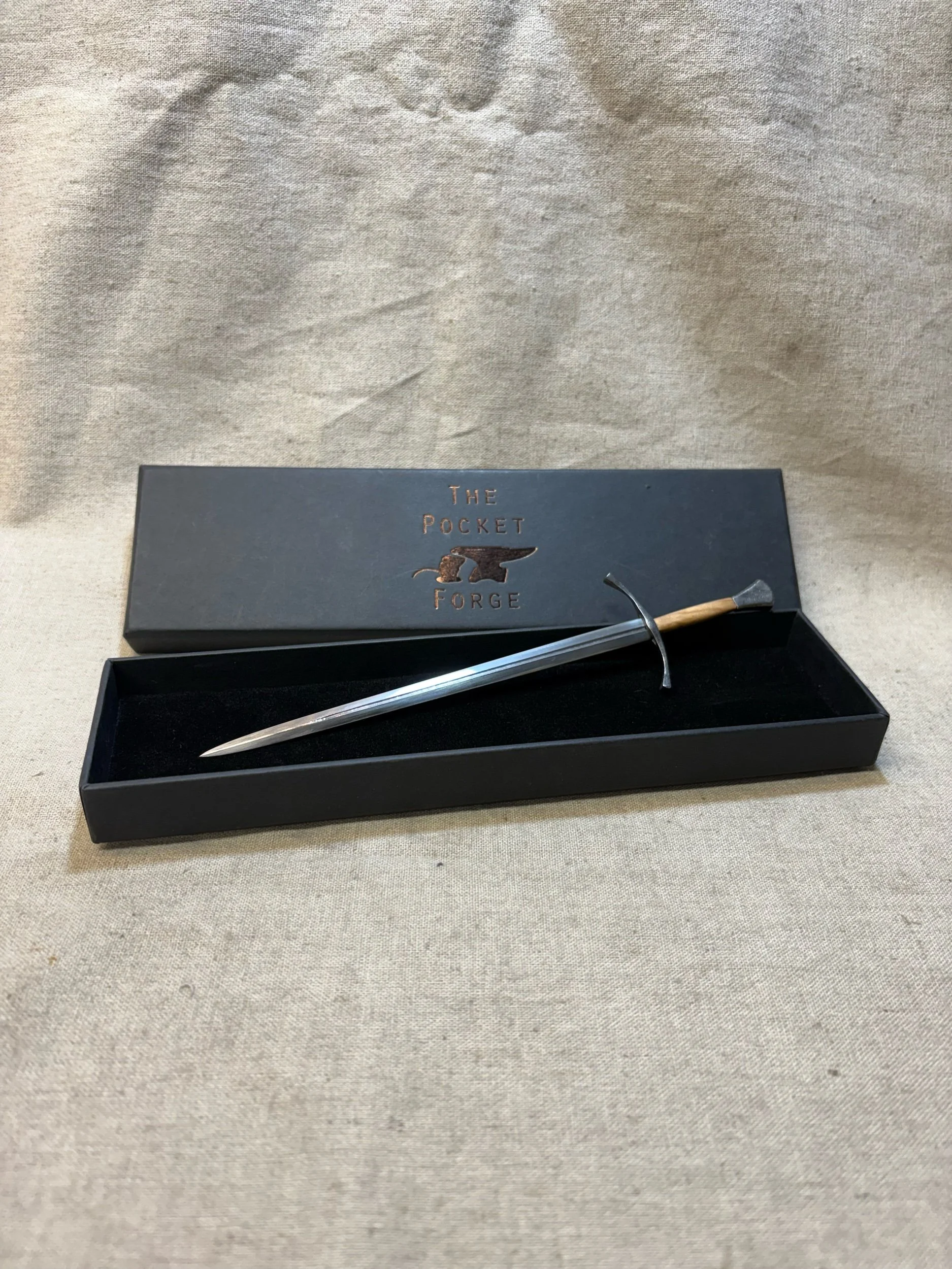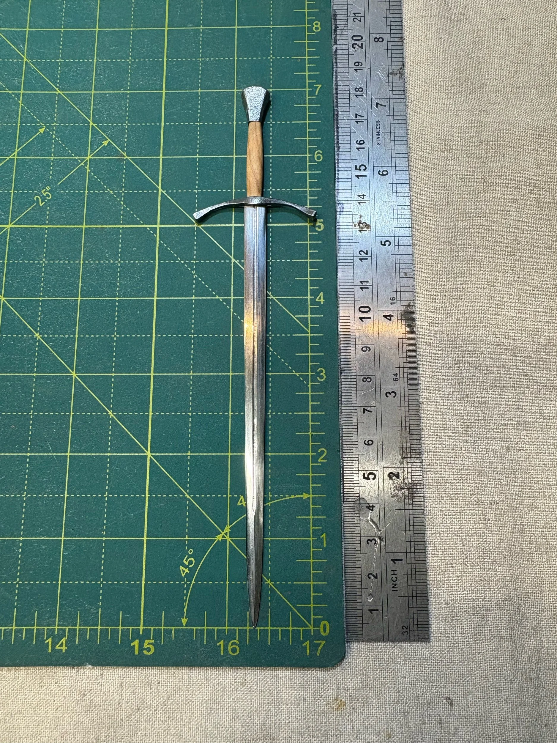 This is a tiny medieval arming sword in 1:6 scale. It's forged by hand exactly the same way a full sized piece would be, heat treated and tempered, with a tang that runs through the handle, and is peened at the end of the pommel. This piece has a simple style with a forged finish on the fittings and a wooden handle. Perfect for a tiny bandit, skeleton minion or low level adventurer!