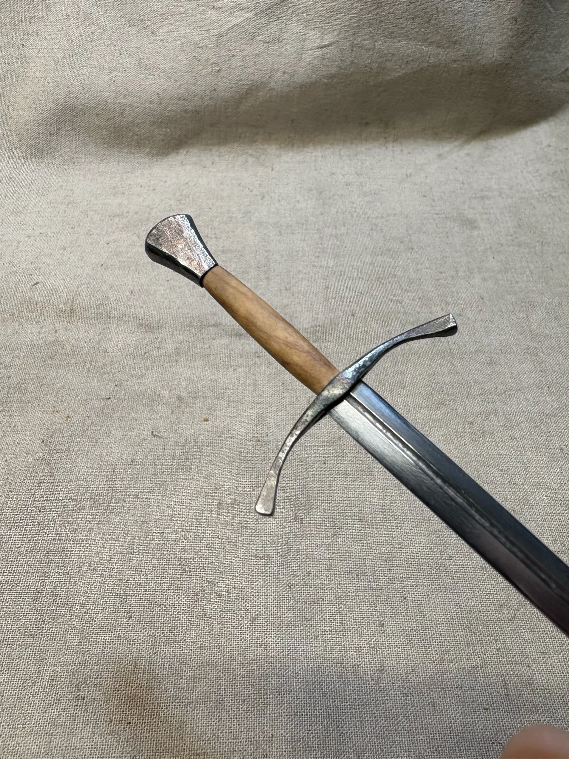 The blade is forged from high carbon silver tool steel, and has a tapered blade with a narrow fuller. It has a fishtail style pommel, and a curved crossguard , made from mild steel with a forged finish.