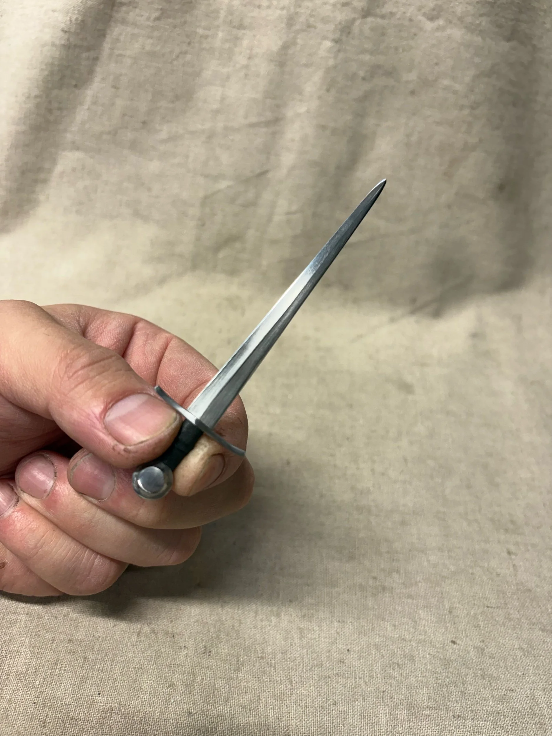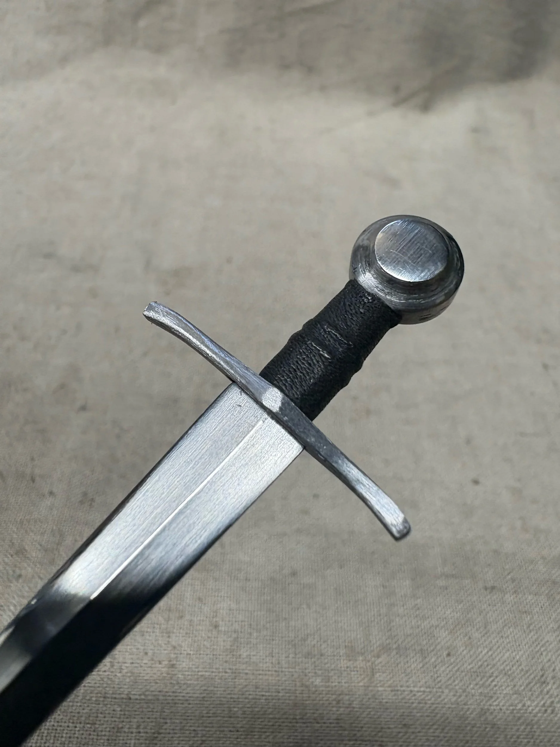 The blade is forged from high carbon silver tool steel, and has a tapered blade with a flattened diamond geometry and a strong central ridge. It has a wheel style pommel, and a slim crossguard , made from mild steel with a forged finish.