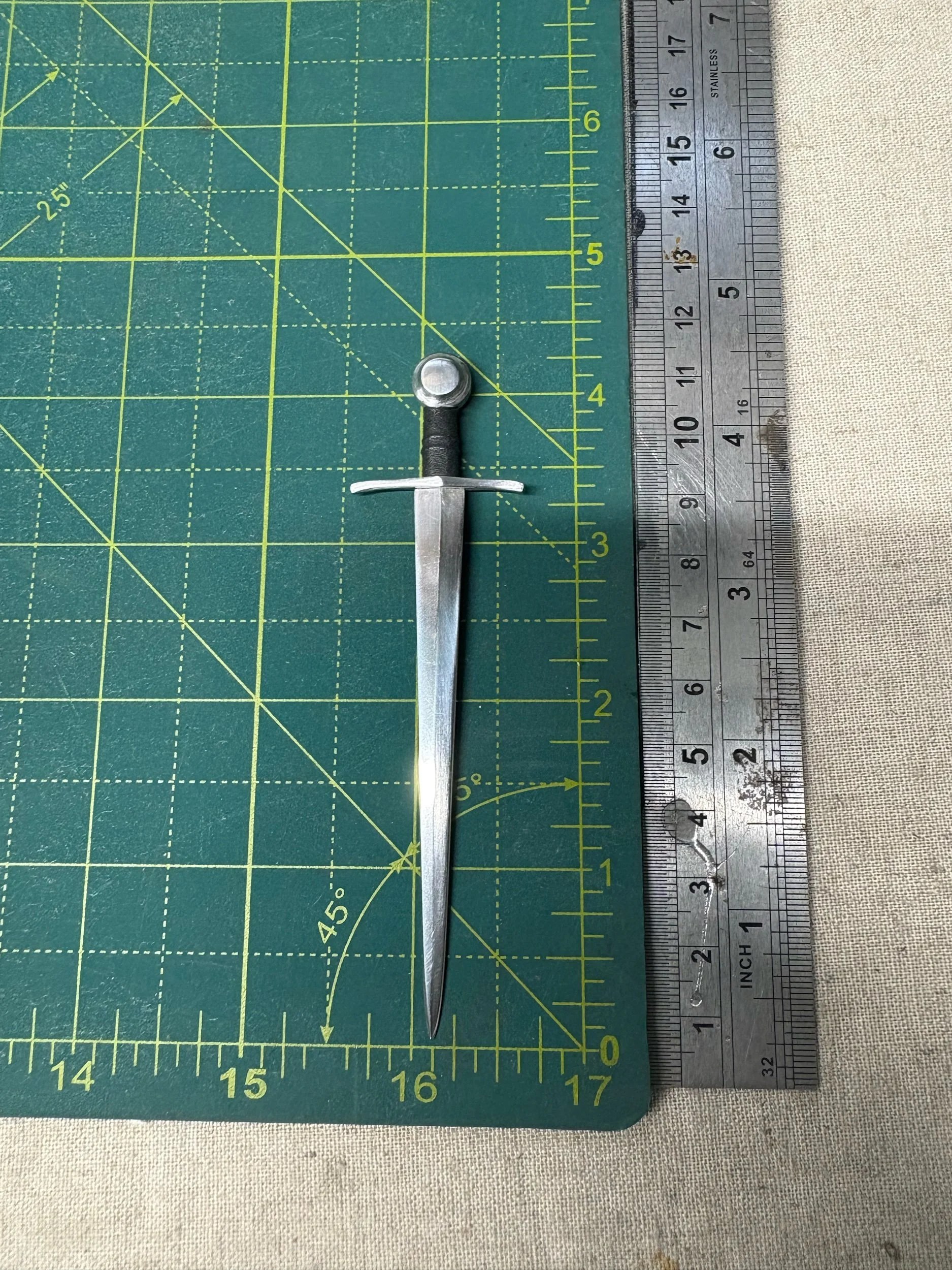 This is a tiny medieval arming short sword in 1:6 scale. It's forged by hand exactly the same way a full sized piece would be, heat treated and tempered, with a tang that runs through the handle, and is peened at the end of the pommel. An ideal sidearm for a tiny archer, rogue or halfling warrior!