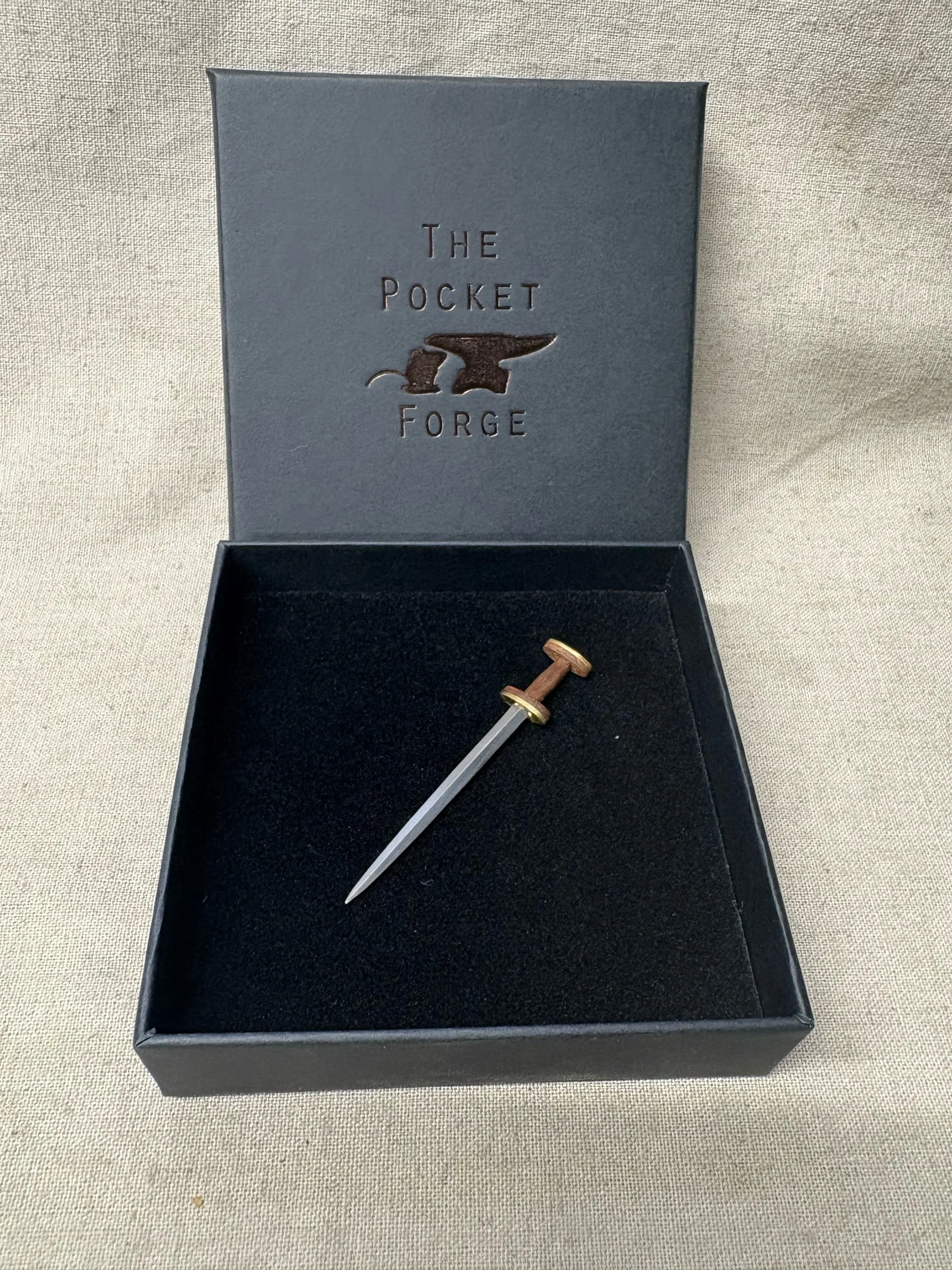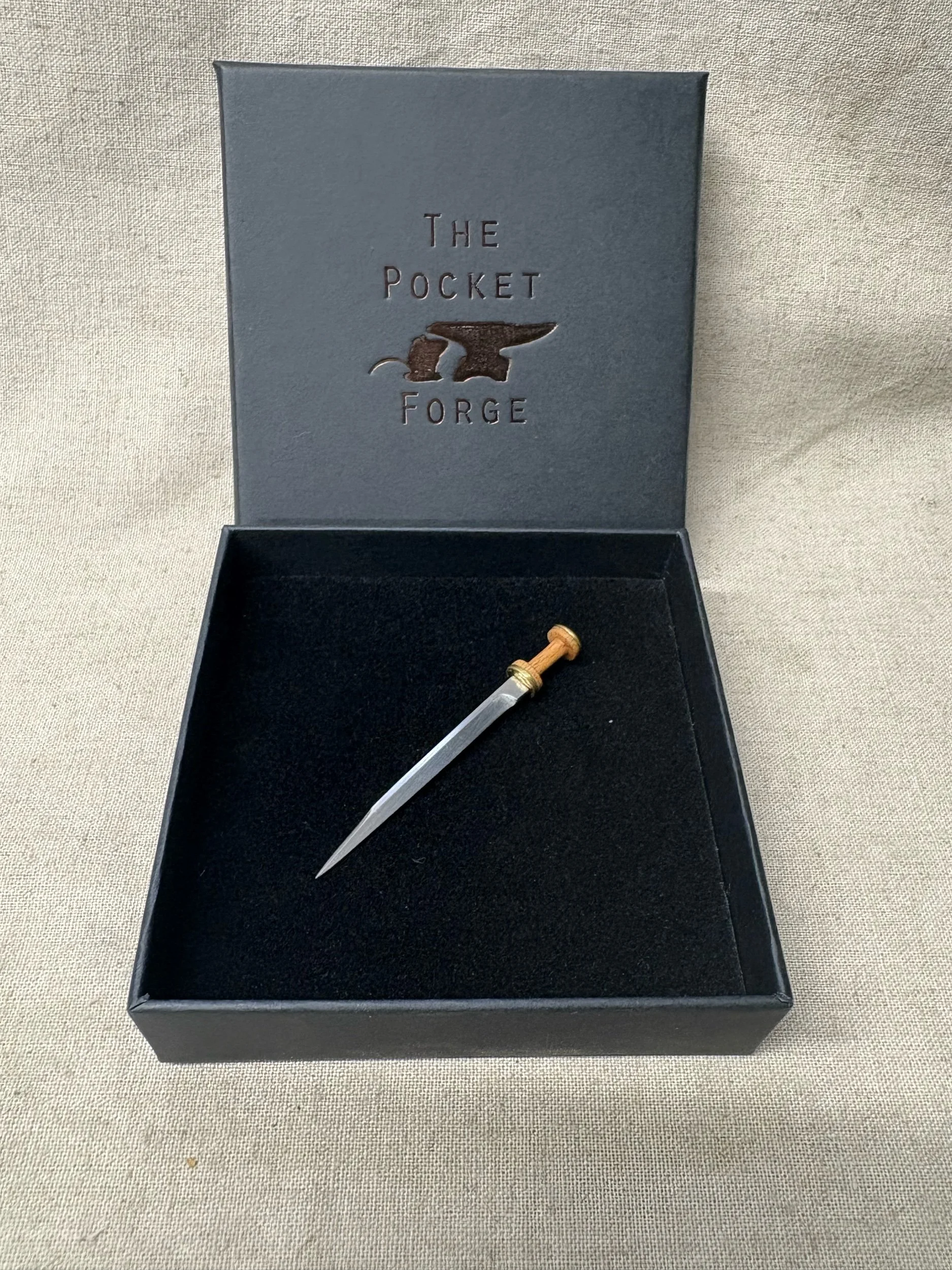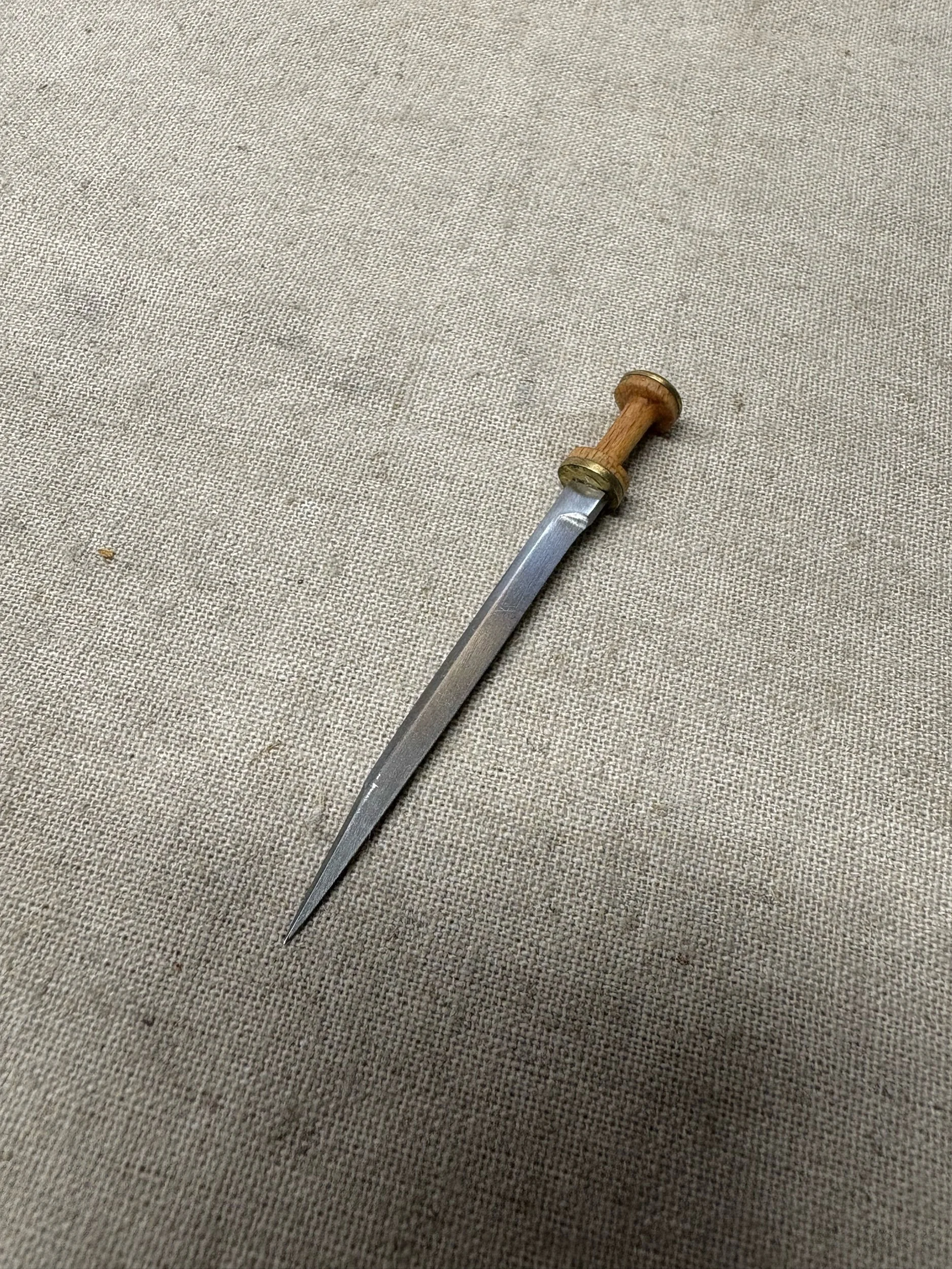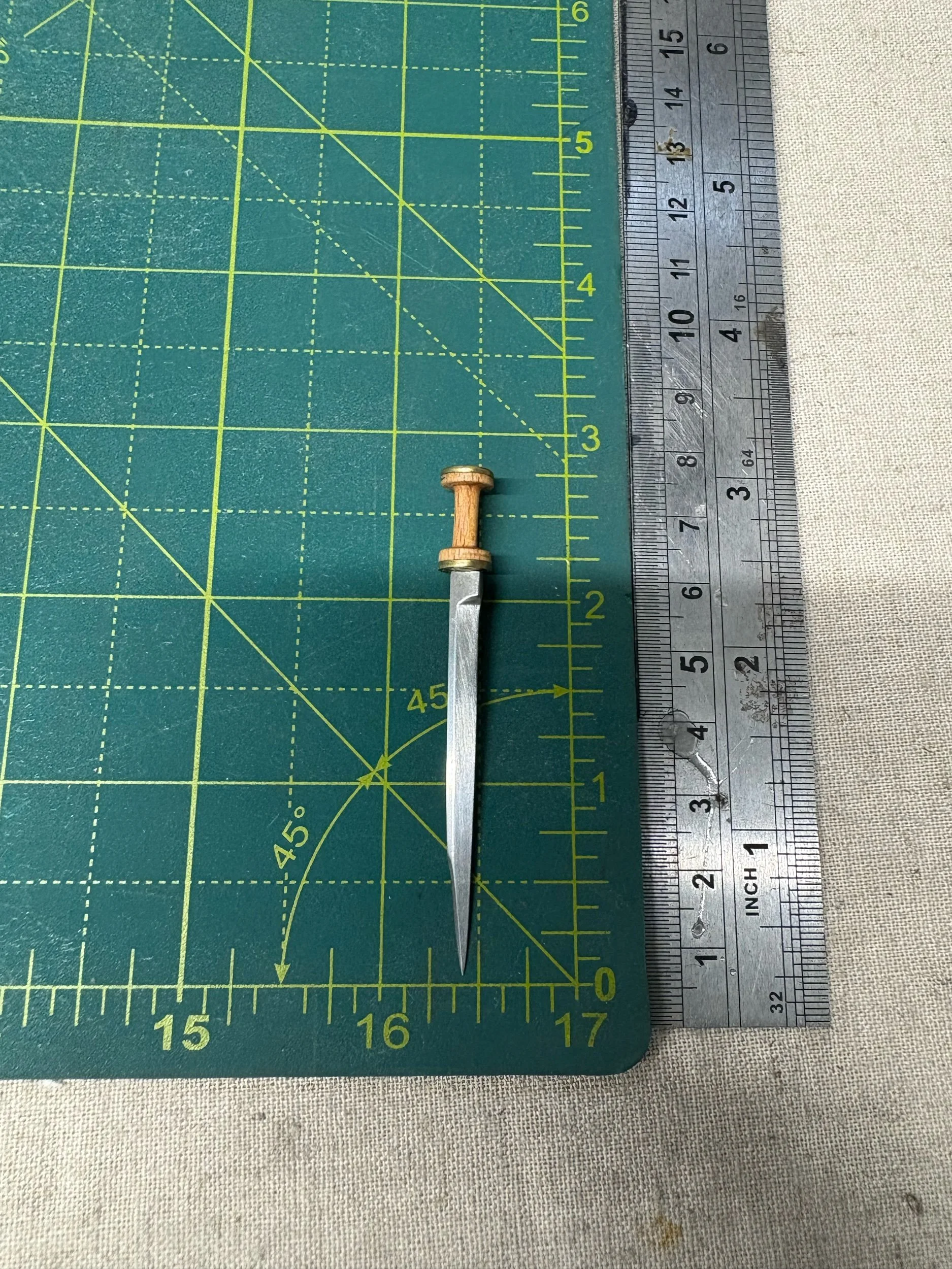 This is a tiny medieval dagger in 1:6 scale. It's forged by hand exactly the same way a full sized piece would be, heat treated and tempered, with a tang that runs through the handle, and is peened at the end of the handle.