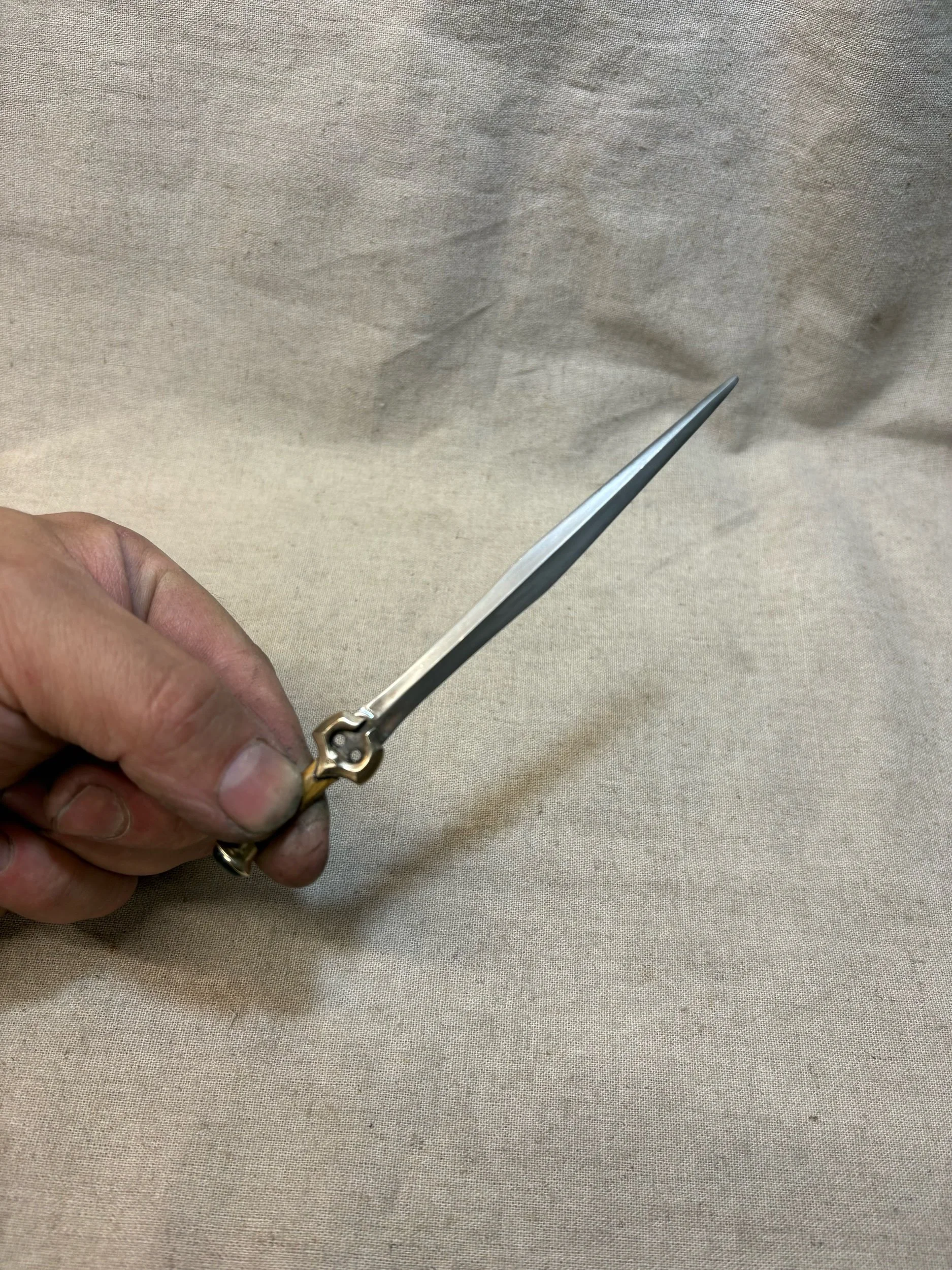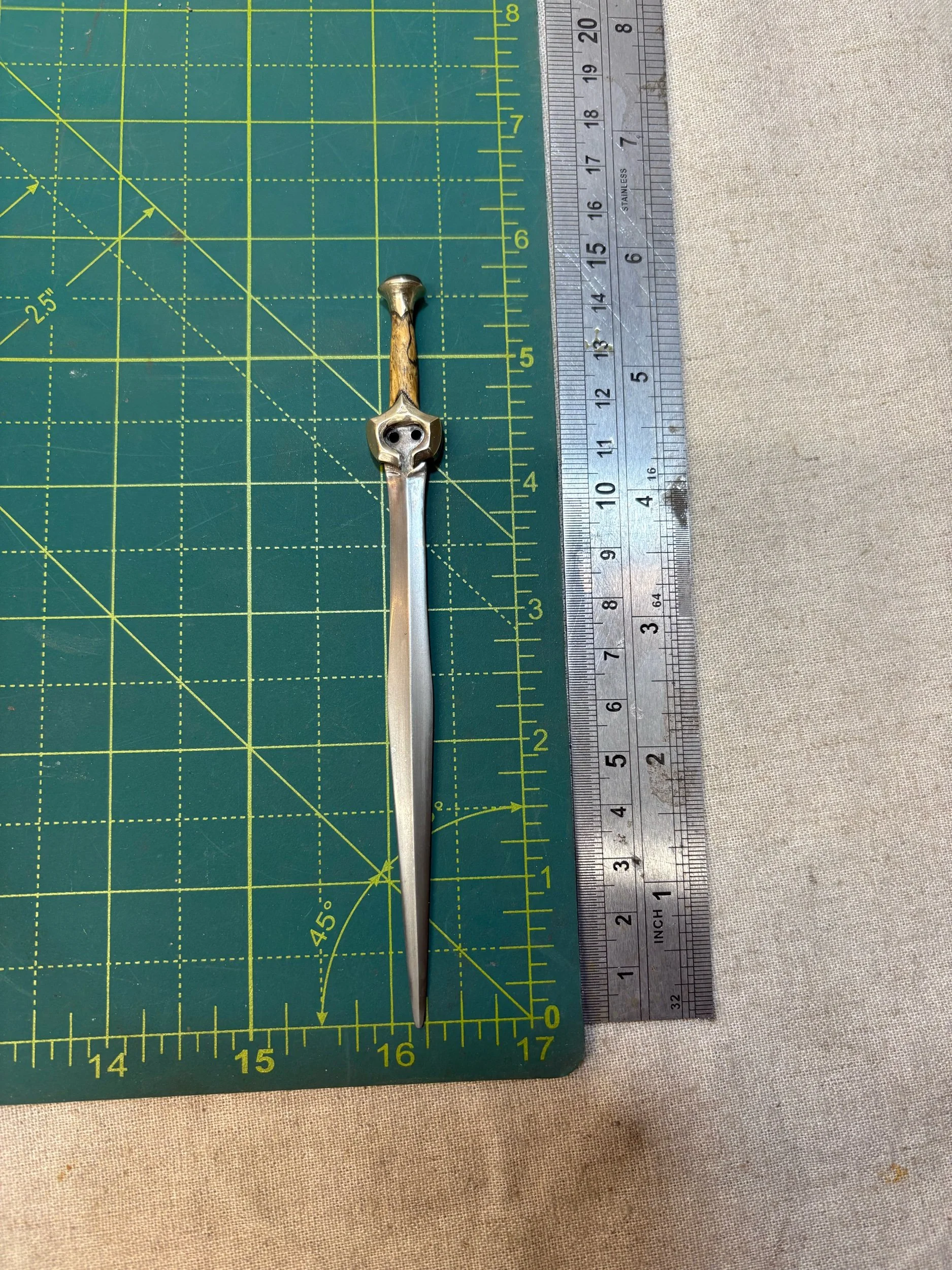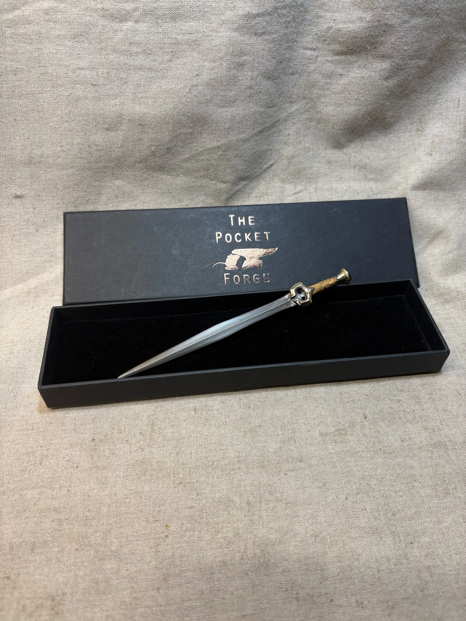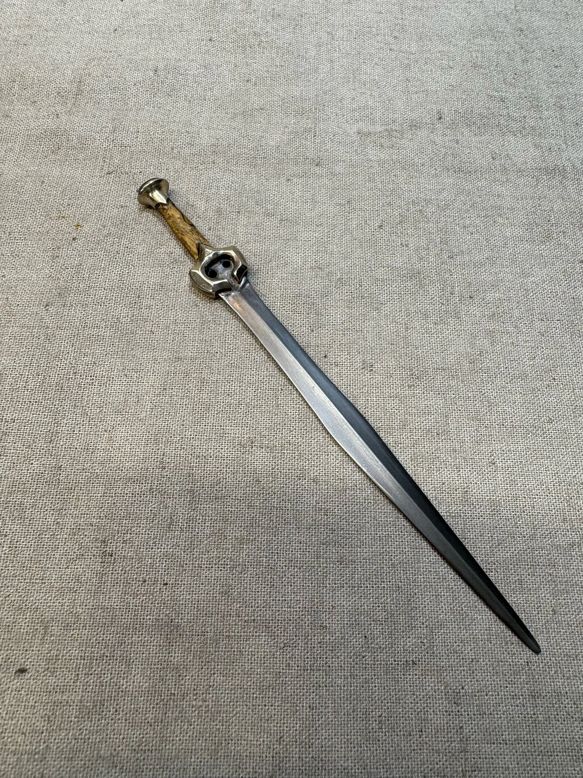 This miniature fantasy sword is an original design, inspired by ancient Greek swords such as the Xiphos and Roman Gladius. It was forged by hand with a hammer and anvil, and is constructed the same way a full sized sword would be, except at 1/6 scale. It has a light patina on the blade to give it an antique feel.