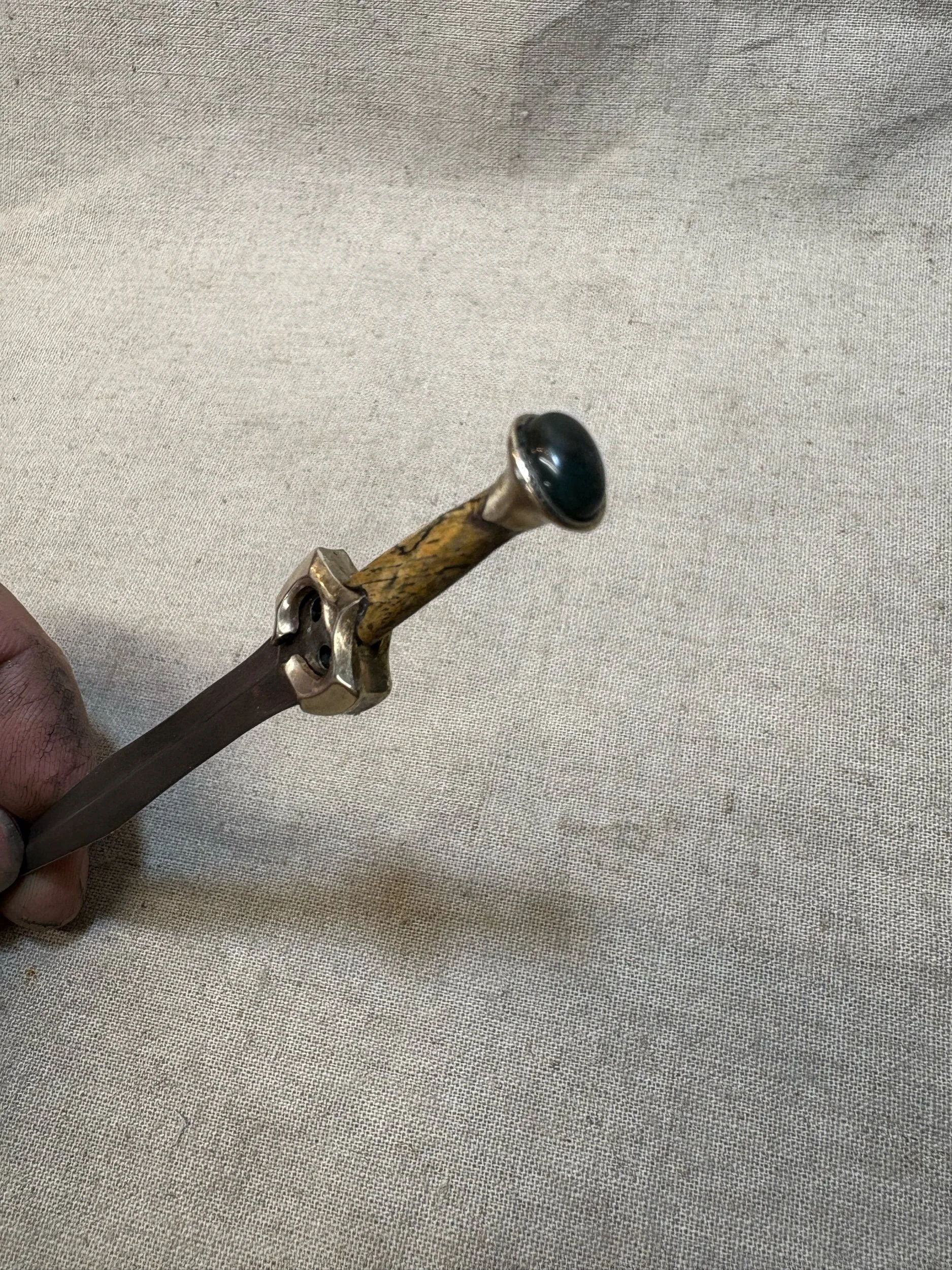 It is a unique handmade piece, and should be handled with care. To protect it from rust, it has been coated in renaissance wax, but it is recommended to clean and oil the blade should it be handled, as finger prints may rub through and cause corrosion.