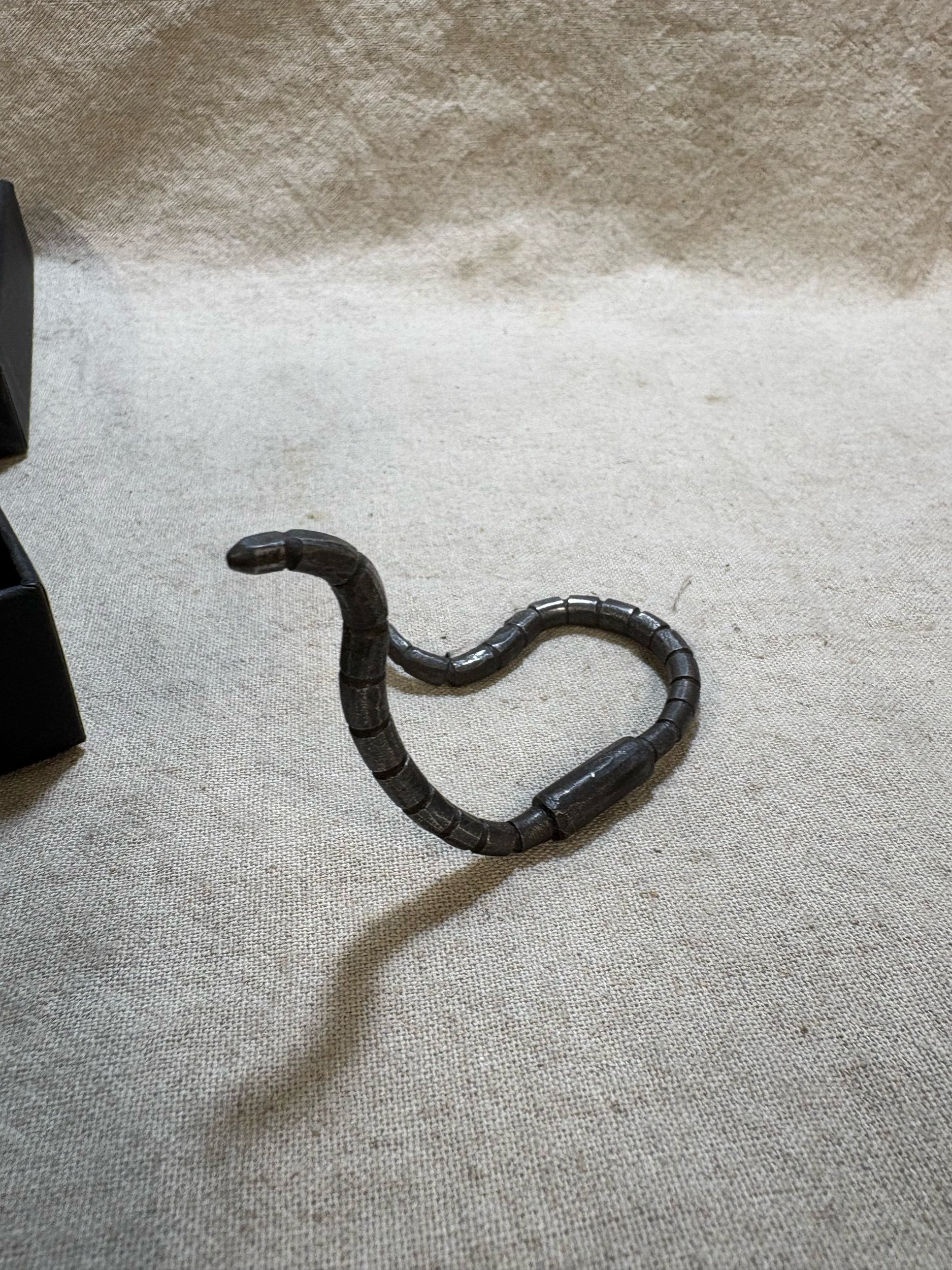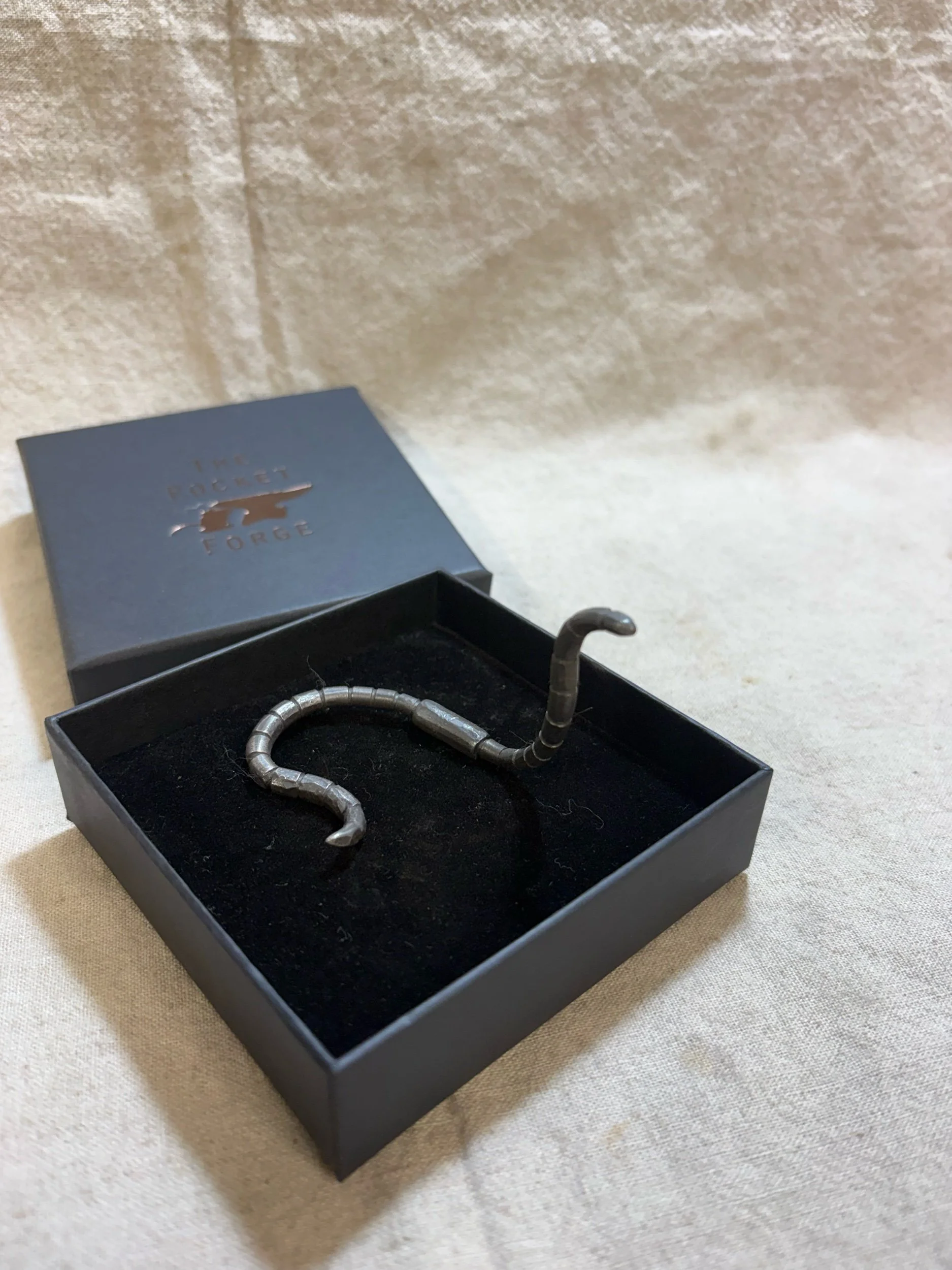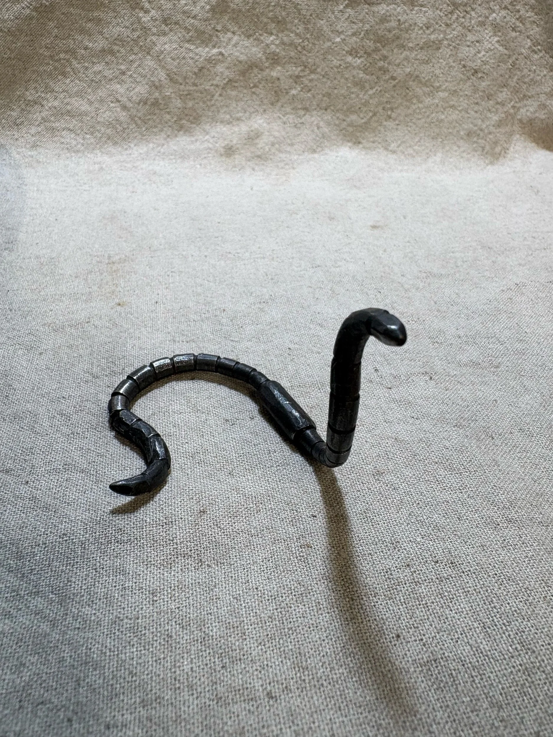 Here is a little handforged worm, made from mild steel with a scale blackened finish. My worms are all handmade and individually shaped, and each one has a unique personality!